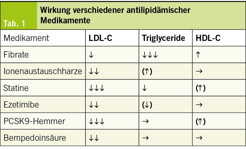 Wenn durch diätetische Massnahmen die Zielwerte nicht erreicht werden, bedarf es in der Sekundärprävention medikamentöser Massnahmen zur Lipidsenkung. Tab. 1 gibt die Wirkung verschiedener, antilipidämischer Medikamente wieder.