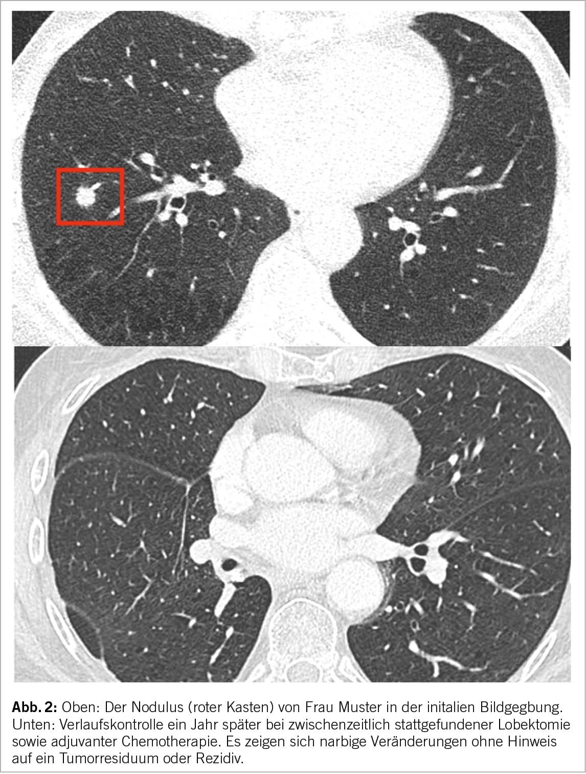 Jede neue Früherkennungsmassnahme muss vor der Übernahme durch die obligatorische Krankenpflegeversicherung auf ihre Wirksamkeit, Zweckmässigkeit und Kosteneffizienz geprüft werden. Diese Beurteilung wird von der Eidgenössischen Kommission für allgemeine Leistungen und Grundsatzfragen (ELGK) vorgenommen, nachdem die betroffenen Kreise beim BAG ein Gesuch eingereicht haben. Als Grundlage hierfür müssen konkrete handlungsleitende Empfehlungen vorliegen. Dieser Herausforderung stellen sich die involvierten Fachgesellschaften zusammen mit den Patientenorganisationen Lungenliga Schweiz und Krebsliga Schweiz. Ein HTA (Health Technology Assessment), welches Abläufe und Empfehlungen zum Screening beinhaltet, wurde im vergangenen Mai von der Kommission für Krebsfrüherkennung veröffentlicht und anschliessend mit verschiedenen Stakeholdern besprochen. Am 15. November 2022 veröffentlichte die Kommission eine offizielle Empfehlung zum Screening mittels niedrigdosierter Computertomographie für Risikogruppen (17). Die medizinische Indikation für ein Niedrigdosis-CT-Screening müsste in jedem Fall von einem Arzt gestellt werden, um von der obligatorischen Krankenpflegeversicherung übernommen zu werden. Vorläufige Studienergebnisse einer Schweizer Pilotstudie, in welche Patienten mit erhöhtem Risiko (in Anlehnung an die NELSON Kriterien oder mit einem PLCOm2012 >2.5%) eingeschlossen wurden, zeigt vielversprechende Ergebnisse. Abgesehen von einem grossen Interesse der Allgemeinbevölkerung wurden nahezu 5% der Teilnehmer mit Lungenkrebs diagnostiziert. Jedes der detektierten Lungenkarzinome konnte mit Hilfe eines kurativen Ansatzes behandelt werden (Abb. 2).