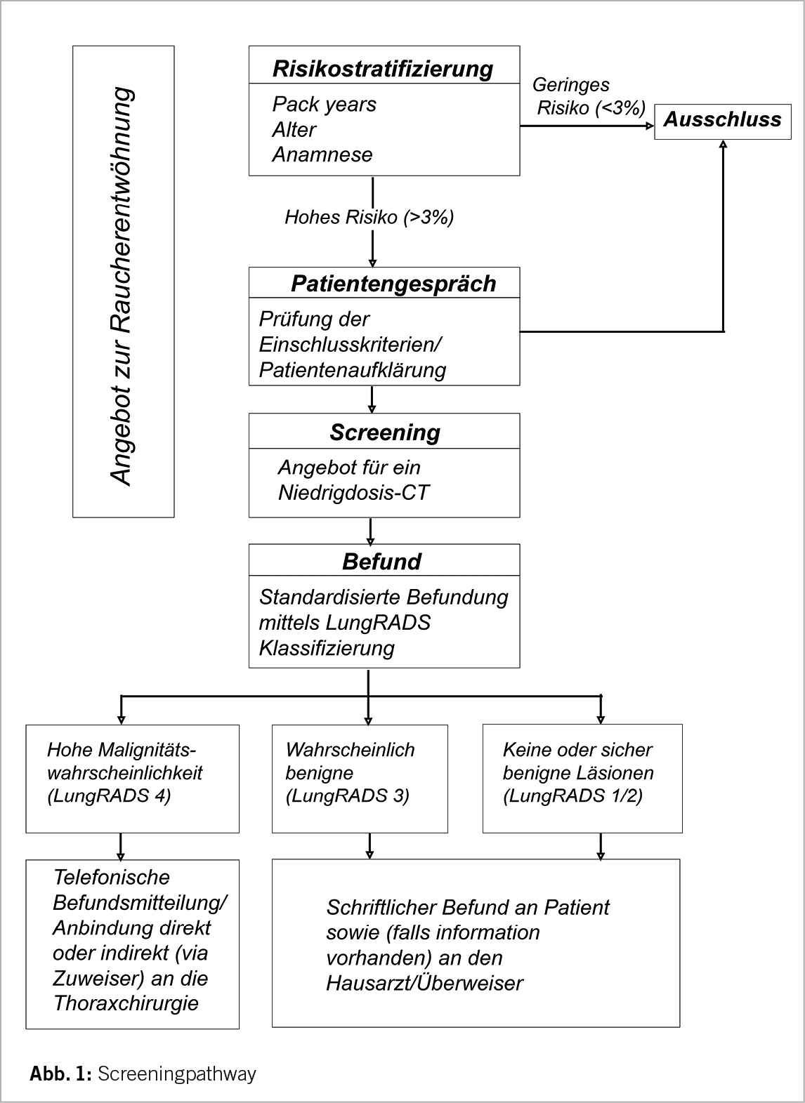 Bevor man einen (Ex-)Raucher zum LDCT-Screening überweist, sollte ein eingehendes Beratungsgespräch erfolgen. In einem ersten Schritt muss geklärt werden, ob der Betreffende die Einschlusskriterien erfüllt (Alter 55 bis 74 Jahre, mindestens 30 py und Raucher oder weniger als 15 Jahre abstinent). Denn nur für diese Risikopopulation konnte ein Überlebensvorteil gezeigt werden. In einem zweiten Schritt muss der Betreffende über die Gefahr von falsch-negativen Befunden sowie die etwaige Erkennung von Nebenbefunden informiert werden. Zudem muss der Patient über die Abläufe, insbesondere im Falle einer möglichen Krebsdiagnose, aufgeklärt werden. Für Patienten, welche die Diagnosekriterien hinsichtlich einer Tumorerkrankung erfüllen, stehen weiterführende Abklärungen sowie die Behandlung (Operation, Strahlentherapie und/oder medikamentöse Therapie) an, welche je nach physischer sowie psychischer Verfassung des Patienten eine hohe Belastung mit sich bringen kann. Der radiologische Befund sollte einen Abschnitt mit den Bildgebungsparametern wie Dosis und verwendetes Protokoll sowie Befundbeschreibung und spezifische Behandlungsempfehlungen enthalten. Standardisierte Vorlagen werden bevorzugt, um eine einheitliche Berichterstattung und die Einhaltung von Richtlinien zu gewährleisten. Es sollten computergestützte Erkennungssysteme mit künstlicher Intelligenz verwendet werden, um die Variabilität bei der Messung zu verringern. Jeder Nodulus wird nach etablierten Klassifikationssystemen wie LungRADS 2.0 oder NELSON (6, 14) eingeteilt und dementsprechend Behandlungsempfehlungen bzw. Intervalle für die Verlaufskontrolle festgelegt. Patienten mit behandlungsrelevanten Befunden können entweder von ihrem zuweisenden Arzt über die Befunde informiert werden oder direkt an die Sprechstunde der hausinternen Thoraxchirurgie angebunden werden. Bezüglich der Screeningintervalle bei negativen Befunden liefert die Literatur kontroverse Daten; während in den bisherigen grossen Studien ein jährliches Follow-Up erfolgte hat die MILD-Studie zum ersten Mal bewiesen, dass ein zweijährliches LDCT eine vergleichbare Verringerung der Mortalität bei Personen mit einer negativen Ausgangsuntersuchung erreichen kann (15). Künftig könnten Scores, die auf individuellen Risikobewertungen beruhen, die Screening-Follow-Ups weiter stratifizieren (5). Eine Übersicht ist in Abb. 1 dargestellt.
