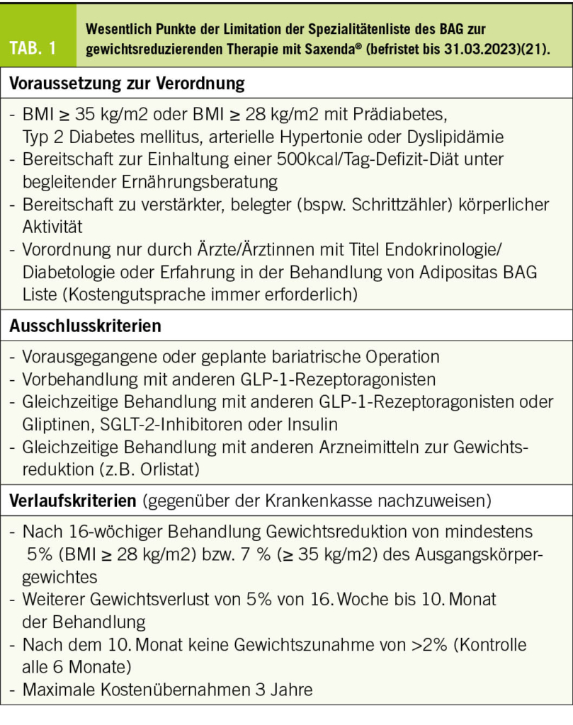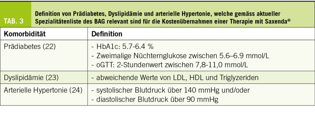 Die Limitatio der Spezialitätenliste definiert als Kriterium für eine Kostenübernahme einer Behandlung mit Saxenda® einen BMI von >28 (bis 35) kg/m2 verbunden mit dem Bestehen mindestens einer Übergewichts-assoziierten Komorbidität wie Prädiabetes, Dyslipidämie oder arterieller Hypertonie (Tab. 3). Einerseits macht die Konzentration der Finanzierung der Therapie auf Personen mit entsprechenden Komorbiditäten aus unserer Sicht Sinn, andererseits kann jedoch die explizite Einschränkung auf einzelne Komorbiditäten problematisch sein. Neben dieser BAG-seitig willkürlich definierten Komorbiditäten könnte man ebenso als finanzierungsbegründende Komorbiditäten das Schlafapnoesyndrom oder die Steatosis hepatis respektive Steatohepatitis aufführen. Ebenso sollten funktionelle Einschränkungen wie beispielsweise eine Gonarthrose sowie auch psychosoziale Beeinträchtigungen durch das Übergewicht Berücksichtigung finden. Letztlich ist es wie immer Aufgabe der ärztlichen Tätigkeit, eine differenzierte Abwägung hinsichtlich einer potenziellen Behandlungsindikation vorzunehmen.