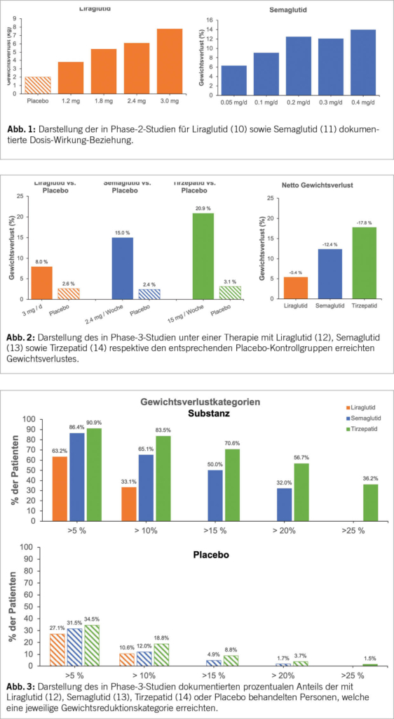 Um die Effektivität der erwähnten Substanzen darzustellen, haben wir die Daten von drei grossen Phase-3-Studien zusammengefasst (12–14). Aus streng wissenschaftlicher Sicht ist diese Gegenüberstellung nicht valide, da es sich nicht um ganz vergleichbare Untersuchungskollektive handelt. Auch die Basistherapie im Sinne einer Lifestyleintervention, welche sowohl die Verum- als auch die Placebo-Gruppen erhielten, war zwischen den Studien nicht identisch. Der Body-Mass-Index (BMI) zu Beginn der Behandlung war mit 38 kg/m2 in den unterschiedlichen Behandlungsgruppen sowie auch die Behandlungsdauer (Liraglutid und Tirzepatid 72 Wochen, Semaglutid 68 Wochen) jedoch gut vergleichbar. An dieser Stelle sei nochmals explizit erwähnt, dass Tirzepatid nicht zur Behandlung der Adipositas zugelassen ist und dass wir uns bei der Darstellung der Ergebnisse auf die höchste, der in der Studie eingesetzten Tirzepatid Dosen von 15 mg s.c. pro Woche beschränken.