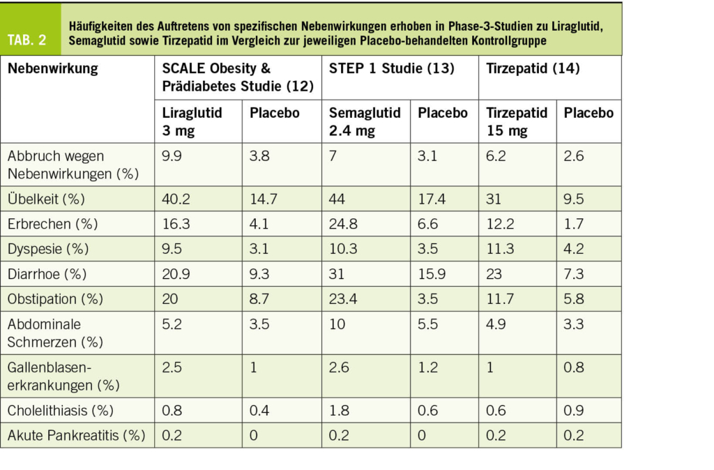 Wie die meisten medikamentösen Therapien haben auch die beschriebenen Medikamente der Adipositastherapie Nebenwirkungen. Eine Übersicht der in den drei analysierten Studien vermehrt beobachteten Nebenwirkungen haben wir in Tabelle 2 zusammengefasst. Dabei stehen gastrointestinale Beschwerden klar im Vordergrund. Diese treten meist zu Beginn der Behandlung auf und lassen sich durch eine langsame Dosissteigerung oft limitieren. Im weiteren Verlauf verschwinden sie dann häufig oder reduzieren sich zumindest auf ein akzeptables Ausprägungsniveau. Es gibt jedoch auch Personen, welche die Medikamente schlichtweg nicht vertragen oder ein unzureichendes Ansprechen auf die Therapie zeigen. In dieser Situation sollte die Therapie frühzeitig beendet werden.