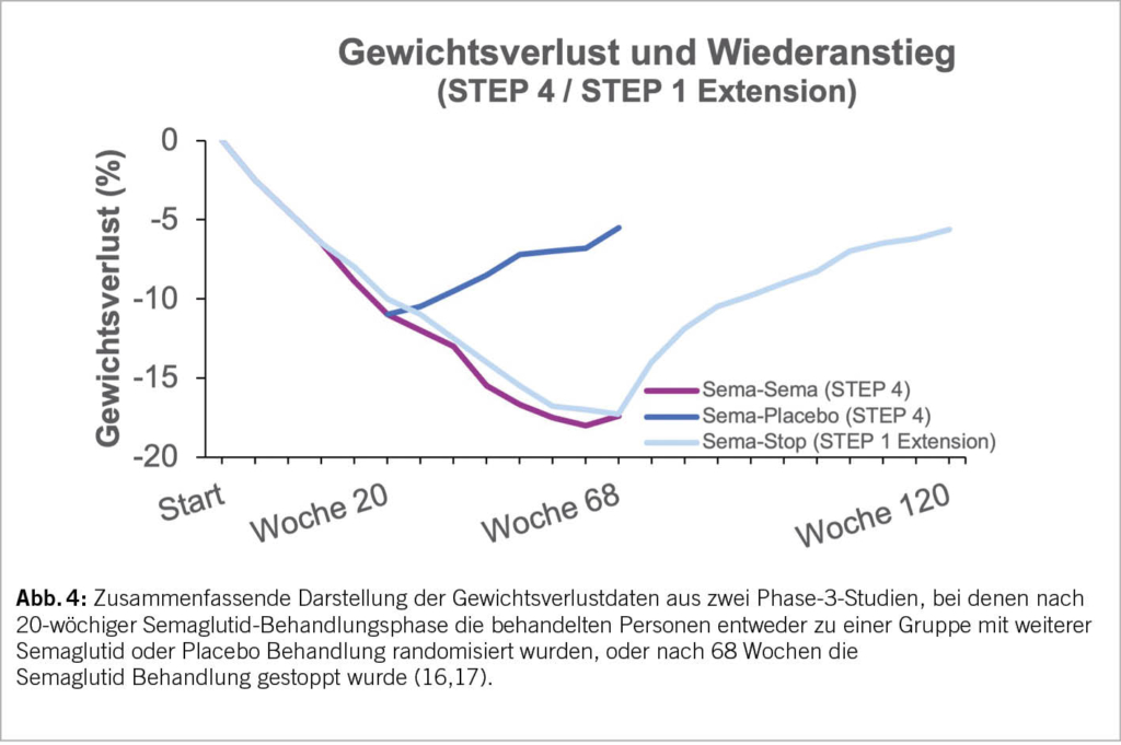 Adipositas ist eine chronische Erkrankung. Wir gehen heute davon aus, dass ein einmal erreichtes Körpergewicht im Sinne eines «Setpoints» über komplexe Regulationsmechanismen gegen Gewichtsreduktionsbemühungen sehr effektiv verteidigt wird. Wissenschaftliche Untersuchungen zeigen konsistent, dass es zu einem Wiederanstieg des Körpergewichtes kommt, sobald die Therapie, sei es eine Ernährungs- oder Bewegungs-Intervention, eine medikamentöse Therapie oder auch eine invasive Therapie, wie ein Magenballon oder Magenband, beendet wird. Dieses Grundprinzip der Adipositasmedizin wurde auch für die Behandlung mit Semaglutid einmal mehr eindrucksvoll dokumentiert. Abbildung 4 fasst zur Illustration die Daten der STEP 4 (16) sowie der STEP 1 trial extention Studie (17) zusammen. In der STEP 4 Studie wurden die eingeschlossenen Personen nach einer 20-wöchigen Semaglutid Behandlung, entweder zu je einer Gruppe mit weiteren Semaglutid- oder Placebo-Gaben randomisiert. In der STEP 1 trial extention Studie wurde Semaglutid nach 68 Wochen gestoppt. Es zeigte sich, dass es nach einem Wechsel auf Placebo oder nach Semaglutid-Stopp zu einem zügigen Wiederanstieg des Körpergewichts kam. Folglich sollte eine medikamentöse Adipositasbehandlung eine Dauertherapie darstellen, um langfristig erfolgreich zu sein.