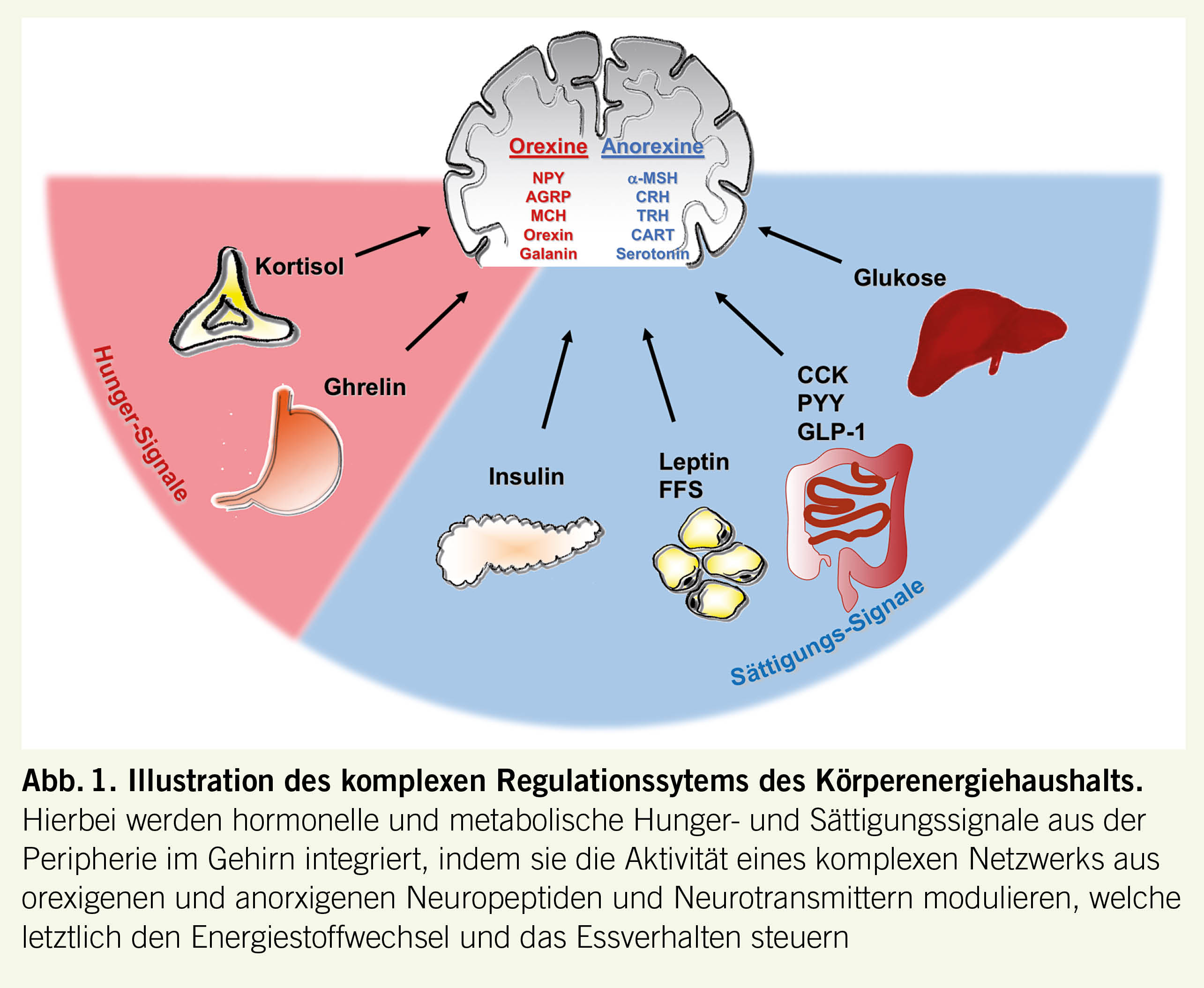 Adipositas entsteht durch eine über einen längeren Zeitraum anhaltende positive Energiebilanz, das heisst, der Köper nimmt mehr Energie auf als er verbraucht. Neben der körperlichen Aktivität ist dabei die Nahrungsaufnahme und somit das Essverhalten ein wesentlicher Faktor. Es gibt viele wissenschaftliche Belege dafür, dass der Körperenergiestatus und damit das Körpergewicht einer komplexen, neuroendokrinen Regulation unterliegen. Dabei geben viele periphere, hormonelle Signale wie z.B. das Adipokin Leptin aus dem Fettgewebe oder gastrointestinale Peptidhormone wie Ghrelin und Glucagon-like peptide-1 (GLP-1) Rückmeldung an das Gehirn über den aktuellen und längerfristigen Energiestatus. Angriffspunkte dieser Signale im Gehirn sind der Hirnstamm sowie der Hypothalamus, welche durch ein Netzwerk von spezifischen Neuronen über die Freisetzung von orexigenen und anorexigenen Neuropeptiden sowie Neurotransmittern die homöostatische Regulation bewerkstelligen und Gefühle von Hunger und Sättigung steuern (Abb. 1). Ebenfalls integriert werden hier metabolische Signale wie Glukose oder freie Fettsäuren (FFS). In den letzten Jahren hat man zudem herausgefunden, dass die genannten peripheren Signale auch die neuronale Aktivität mesolimbischer Hirnstrukturen, so genannte Belohnungszentren, modulieren und dadurch die hedonische Regulation des Essverhaltens stark beeinflussen. Interessant ist, dass bei adipösen Personen viele funktionelle Veränderungen auf verschiedenen Ebenen dieses komplexen Regulationssystems nachweisbar sind. Vor diesem Hintergrund wundert es nicht, dass fast alle, der neuen Medikamente gegen Adipositas direkt oder indirekt einen zentralnervösen Angriffspunkt haben und durch eine Beeinflussung des Regulationssystems Hunger und Appetit reduzieren.