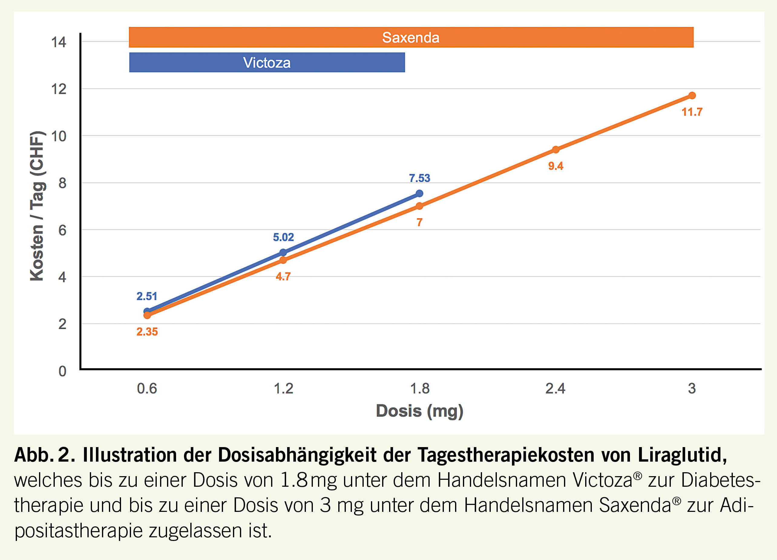 Obgleich von der Swissmedic zur Adipositasbehandlung zugelassen, wurde Liraglutid für diese Indikation bislang noch nicht in die SL aufgenommen. Daher wird z.Zt. eine Behandlung mit Saxenda® von der Grundversicherung nicht bezahlt. Ein Problem ist dabei, dass die Preisgestaltung des Präparats linear dosisabhängig ist und der Preis durch das sich auf dem Markt etablierte Präparat Victoza® zur Diabetestherapie, welches ebenfalls Liraglutid enthält, gesetzt und damit sehr teuer ist (Abb. 2).