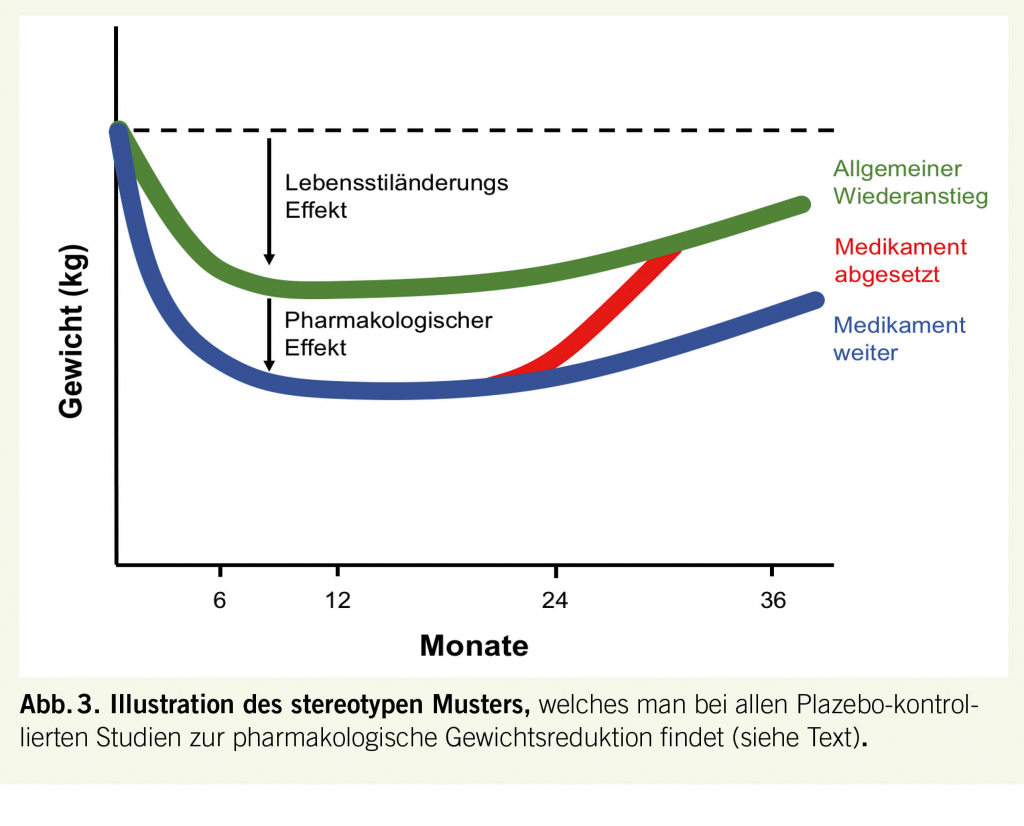 Wie bei anderen chronischen metabolischen Erkrankungen, wie beispielsweise Diabetes, Hypertonie oder Dyslipidämie, wirken entsprechende Medikamente nur solange man sie einnimmt. So zeigen alle Studien zur pharmakologischen Adipositastherapie Substanz-unabhängig konsistent ein ähnliches Muster (Abb. 3). Eine Lebensstiloptimierung führt zu einer Gewichtsreduktion über 6-9 Monaten, danach kommt es zu einem Stillstand und langfristig meist zu einem Wiederanstieg des Gewichts. Die medikamentöse Behandlung bewirkt eine zusätzliche Gewichtsreduktion, welche sich ebenfalls innerhalb der ersten 6-9 Monate etabliert. Danach ist der Gewichtsreduktionseffekt meist erschöpft und das Medikament wird nur noch zum Erhalt des reduzierten Gewichtsniveaus weiter eingesetzt. Setzt man es hingegen ab, kommt es zügig zu einem Wiederanstieg des Gewichts; eine Beobachtung, welche eindrücklich die Effektivität des Regulationssystems und die Chronizität der Erkrankung Adipositas demonstriert. Dies impliziert eine medikamentöse Dauerbehandlung, was die Überprüfung der Sicherheit der verschiedenen Medikamente im Langzeitverlauf unabdingbar macht.