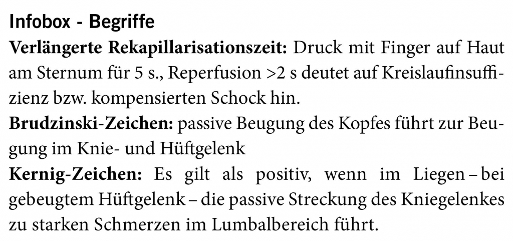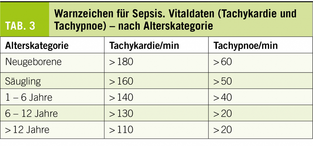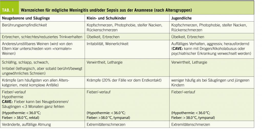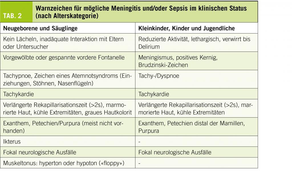 • Sepsis und Meningitis können zusammen auftreten. Auf altersent-sprechende Warnsymptome aus der Anamnese sowie Warnzeichen aus dem Status sind zu achten