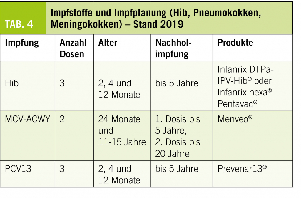Wie die Fallzahlen aus den vergangenen Jahren zeigen, lässt sich das Risiko, an einer Meningitis mit potentiell tödlichen Folgen oder neurologischen Langzeitschäden zu erkranken, durch eine korrekte Immunisierung deutlich senken. Die Impfungen, gemäss Tabelle 4 sind aktiv zu empfehlen.
