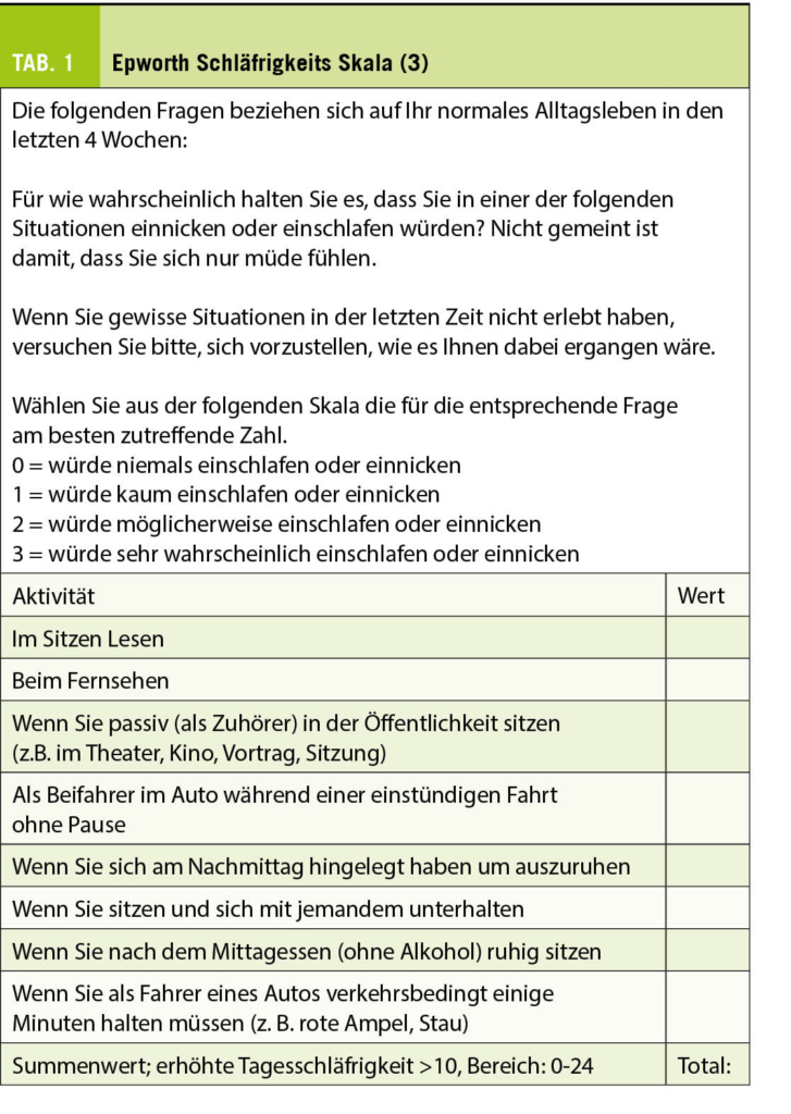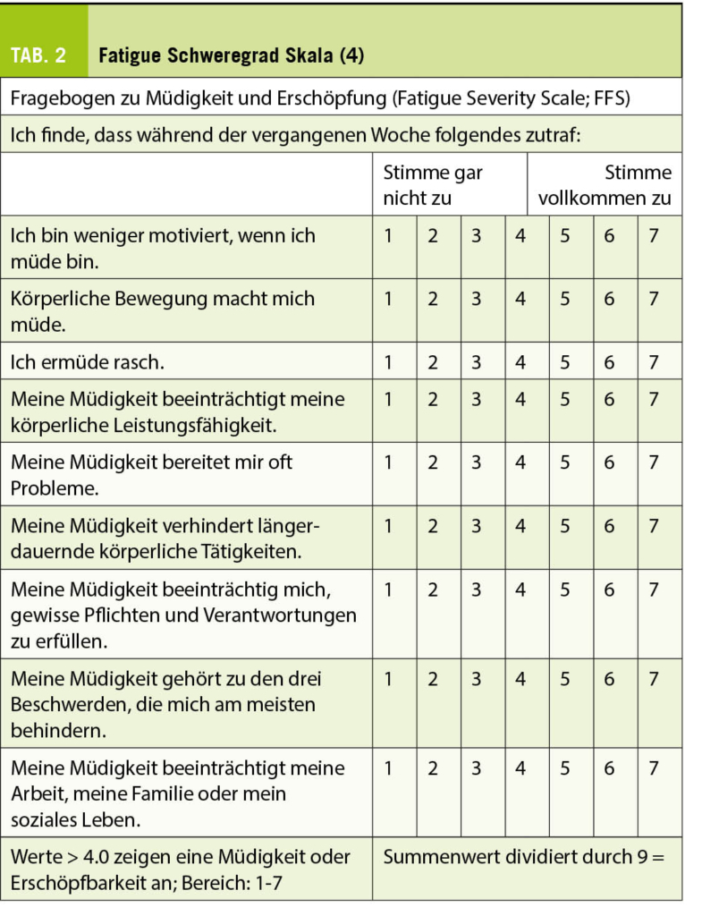 Der Begriff «Müdigkeit» wird für das Gefühl einer ausgeprägten Energielosigkeit verwendet, welche bei mentaler oder körperlicher Tätigkeit noch zunimmt. Der Fatigue Score (4) (Tab. 2) ist deutlich erhöht, der Epworth Skore kann ebenfalls erhöht oder normal sein. Die Einschlaflatenz im MSLT ist aber meistens normal (>10 Minuten). Das Aufstehen am Morgen ist oft ebenfalls verzögert, aber nicht, weil der Wecker gar nicht gehört wird, sondern weil nach dem Erwachen die Energie für das Aufstehen fehlt (= Clinophilie).