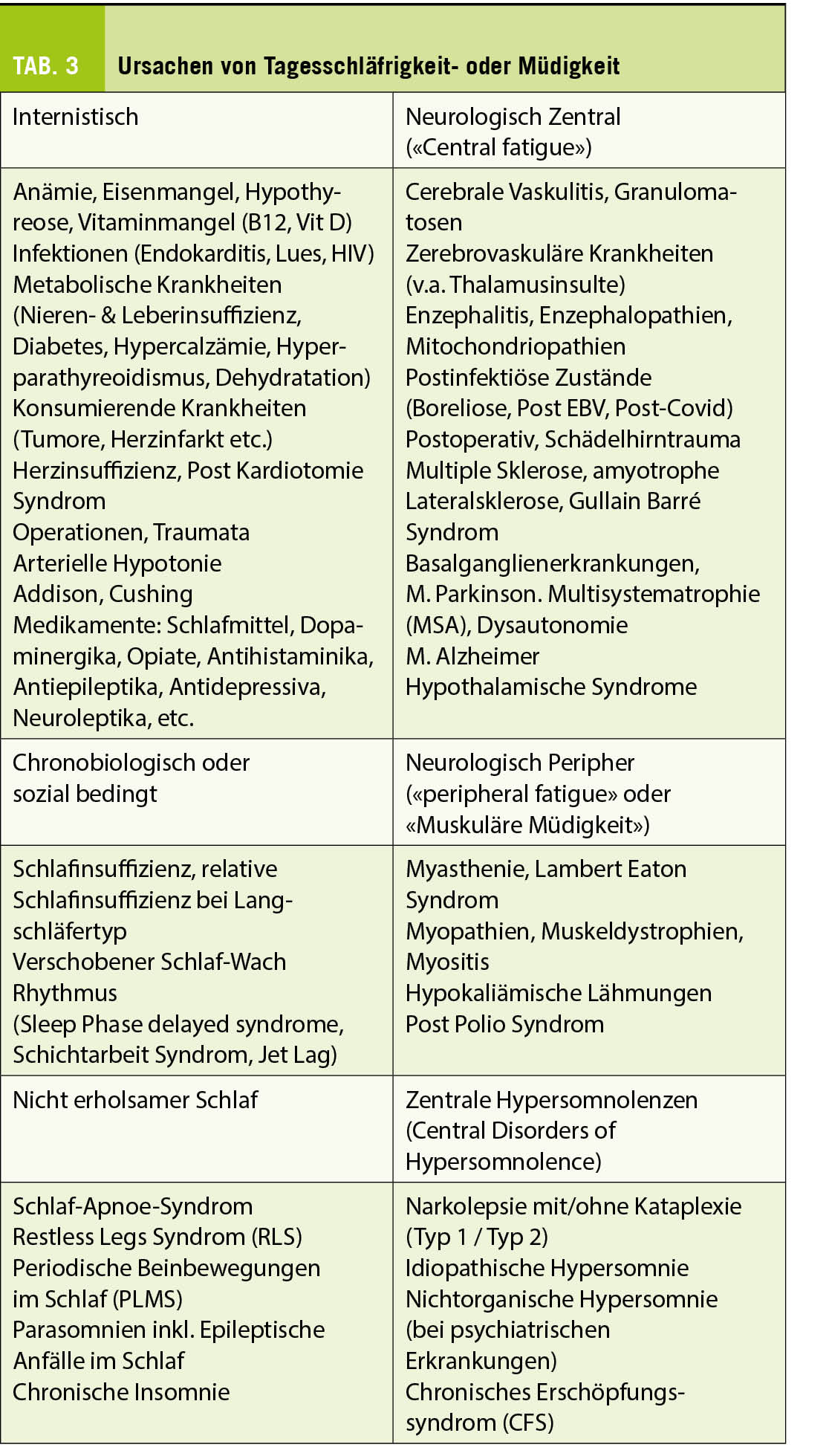 Neben der detaillierten Anamnese einschliesslich Längsverlauf und allfälligen Zusammenhängen zu somatischen oder psychiatrischen Erkrankungen und einer klinischen Untersuchung wird der Hausarzt zum Ausschluss internistischer Ursachen auch einige Laboruntersuchungen durchführen (Tab. 3). Der labormässige Nachweis einer Hypothyreose, einer Anämie, oder eines Eisenmangels dürfte aber eher selten die alleinige Erklärung für eine chronische Müdigkeit oder Schläfrigkeit darstellen.