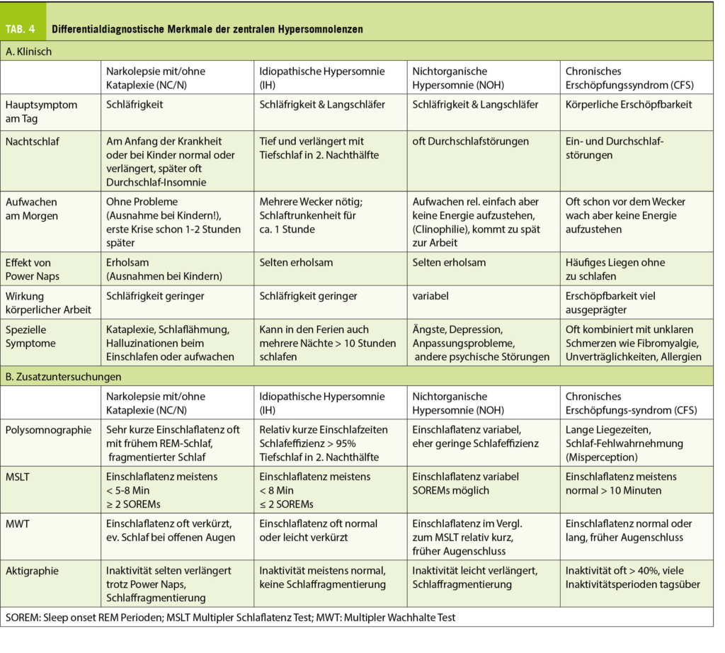 Wenn auch ein nicht erholsamer Schlaf ausgeschlossen wurde, bleibt eine kleine Gruppe von «zentralen Hypersomnolenzen» übrig, zu welchen nebst der Narkolepsie mit und ohne Kataplexie, die Idiopathische Hypersomnie (IH) und die Nichtorganische Hypersomnie (NOH) gehören. Wegen den therapeutischen Konsequenzen müssen diese Ursachen unterschieden, und auch vom Chronischen Erschöpfungssyndrom (CFS) abgegrenzt werden (7). Die Diagnose wird anhand der typischen klinischen Beschwerden (Tab. 4A) und den Resultaten aus den schlafmedizinischen Zusatzuntersuchungen gestellt (Tab. 4B).