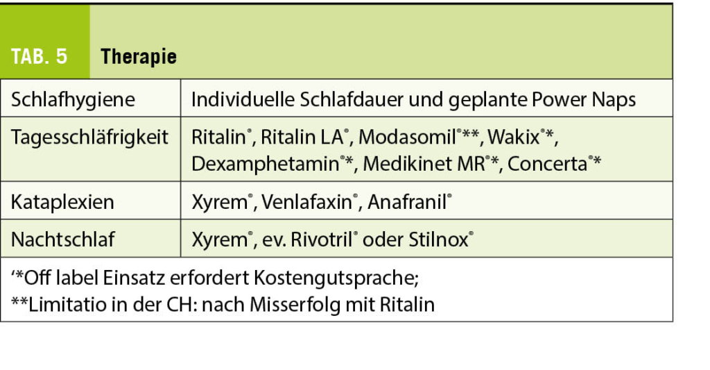 Die Behandlung erfolgt Symptom-orientiert und setzt sich aus nicht medikamentösen und medikamentösen Massnahmen zusammen (Tab. 5), mit dem Ziel, die Schule oder Lehre zu bestehen und die Ausübung des erlernten Berufes zu ermöglichen. Dabei werden gegen die Tagesschläfrigkeit fix geplante Schlafpausen tagsüber mit Stimulantien wie Modasomil®, Ritalin® oder «off label» auch Wakix®, Sunosi® oder Amphetamine kombiniert. Zur Behandlung von Kataplexien gilt Xyrem® heute als Mittel erster Wahl, welches gleichzeitig einen positiven Effekt auf den oft fragmentierten Nachtschlaf bewirkt und interessanterweise auch bei der idiopathischen Hypersomnie das erschwerte Erwachen am Morgen lindern kann (8). Bei nichtorganischen Ursachen und v.a. beim chronischen Müdigkeitssyndrom besteht die Therapie erster Wahl in einem langsam aufbauenden Trainingsprogramm im Rahmen einer Verhaltenstherapie, unterstützt mit aktivierenden Antidepressiva (Wellbutrin®, Venlafaxin®).
