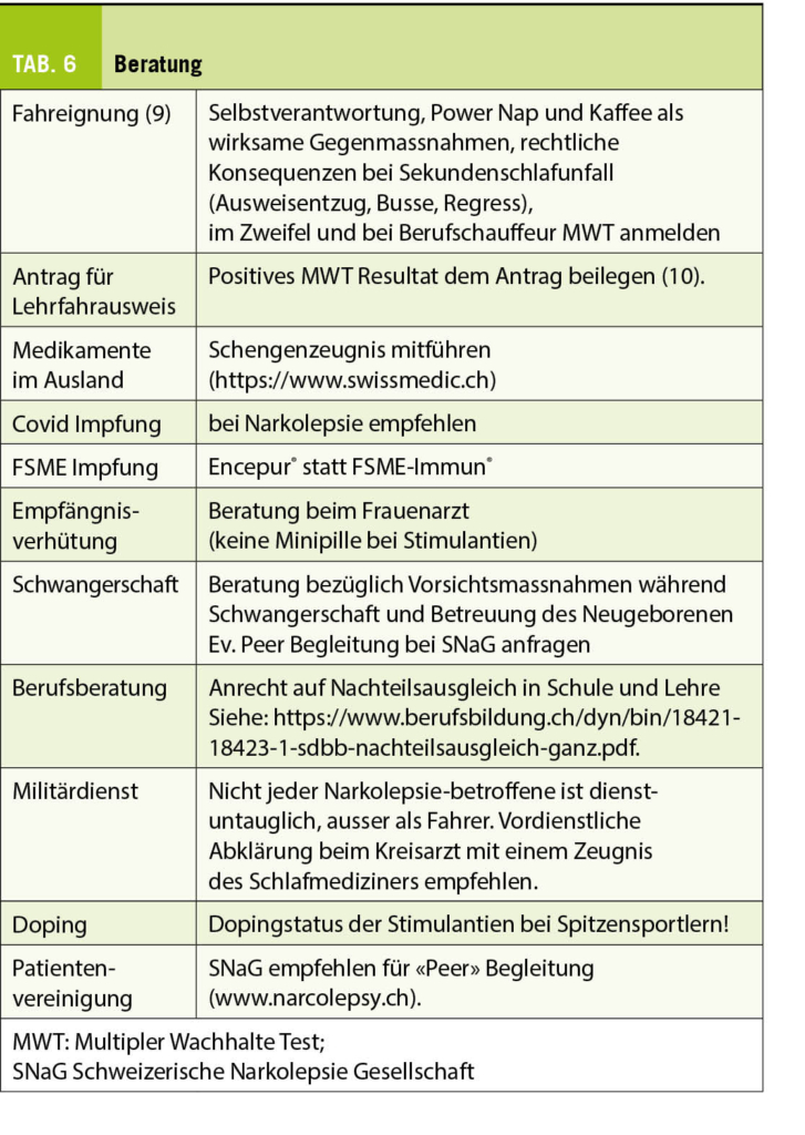 Die Beratung umfasst die Berufswahl, die Familienplanung, die Fahreignung und je nach Tätigkeiten auch weitere Lebensbereiche, wobei eine enge Zusammenarbeit zwischen dem Patienten, dem Hausarzt, dem Schlafspezialisten und situativ auch mit Arbeitgebern und mit Psychologen von grossem Vorteil ist (Tab. 6). Die Patientenvereinigung (www.narcolepsy.ch) bietet die Möglichkeit einer Begleitung durch andere Betroffene, welche bereits Erfahrungen mit Bewältigungsstrategien haben (Peer System).