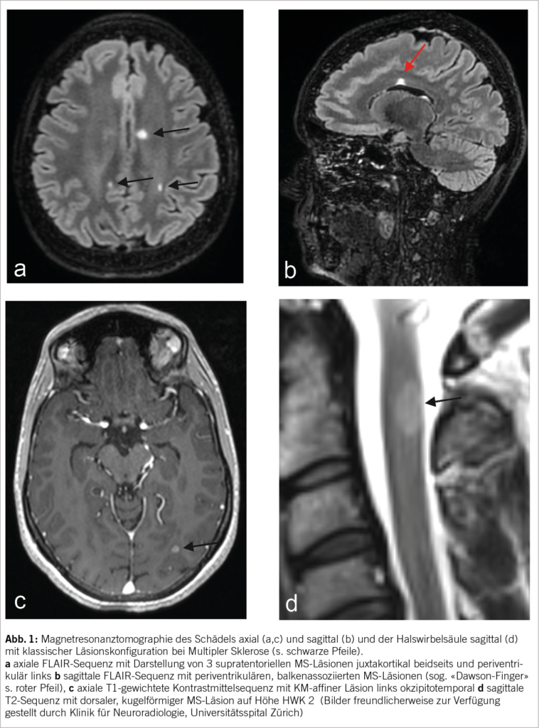 Die Multiple Sklerose ist die häufigste autoimmun vermittelte ZNS-Erkrankung und betrifft vor allem junge Frauen. Charakteristisch ist ein schubförmiger Verlauf. Schübe können sich variabel äussern, häufige Erstsymptome sind eine Optikusneuritis oder Sensibilitätsstörungen. Als bildmorphologisches Korrelat finden sich im MRI der Neuroachse herdförmig verteilte demyelinisierende Läsionen. Neben der Akuttherapie im Falle eines Schubs stehen mittlerweile zahlreiche verlaufsmodifizierende Präparate zur Verfügung, mit denen der Krankheitsverlauf massgeblich beeinflusst werden kann.