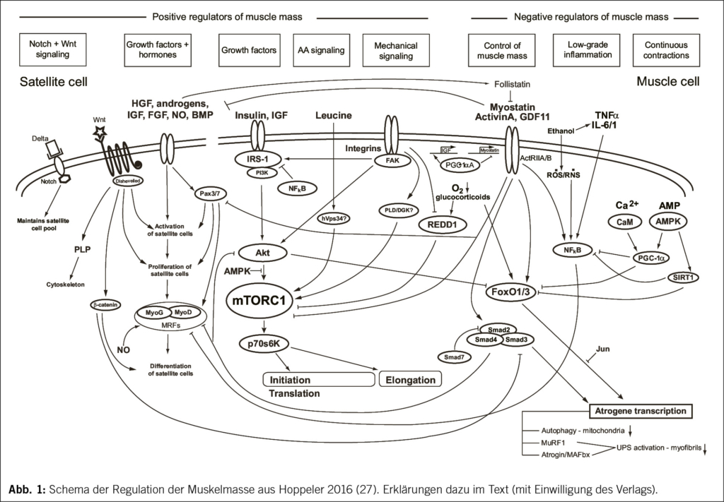 Zentral wird die Muskelmasse durch den molekularen Effektor mTorc geregelt. Dabei ist mTorc für die translatorische Steuerung der Synthese der muskulären und anderer Proteine verantwortlich. Mechanischer Reiz und anabole Hormone scheinen einen dominanten Reiz auf das Wachstum der Muskelzelle zu haben. Wobei mechanischer Reiz kombiniert mit anabolen Hormonen besonders wirksam ist (9). Auch Insulin und Wachstumshormon gehören zu den wesentlichen positiven Regulatoren der Muskelmasse, dabei nimmt die Belastung der Muskulatur selbst einen wesentlichen Einfluss auf die Sekretion der genannten Hormone und Wachstumsfaktoren (10). Als weiterer kritischer Faktor für Muskelwachstum und Muskelerhalt ist die ausreichende Zufuhr von Proteinen über die Nahrung – dabei ist die Aminosäure Leucin der molekular relevante Effektor.