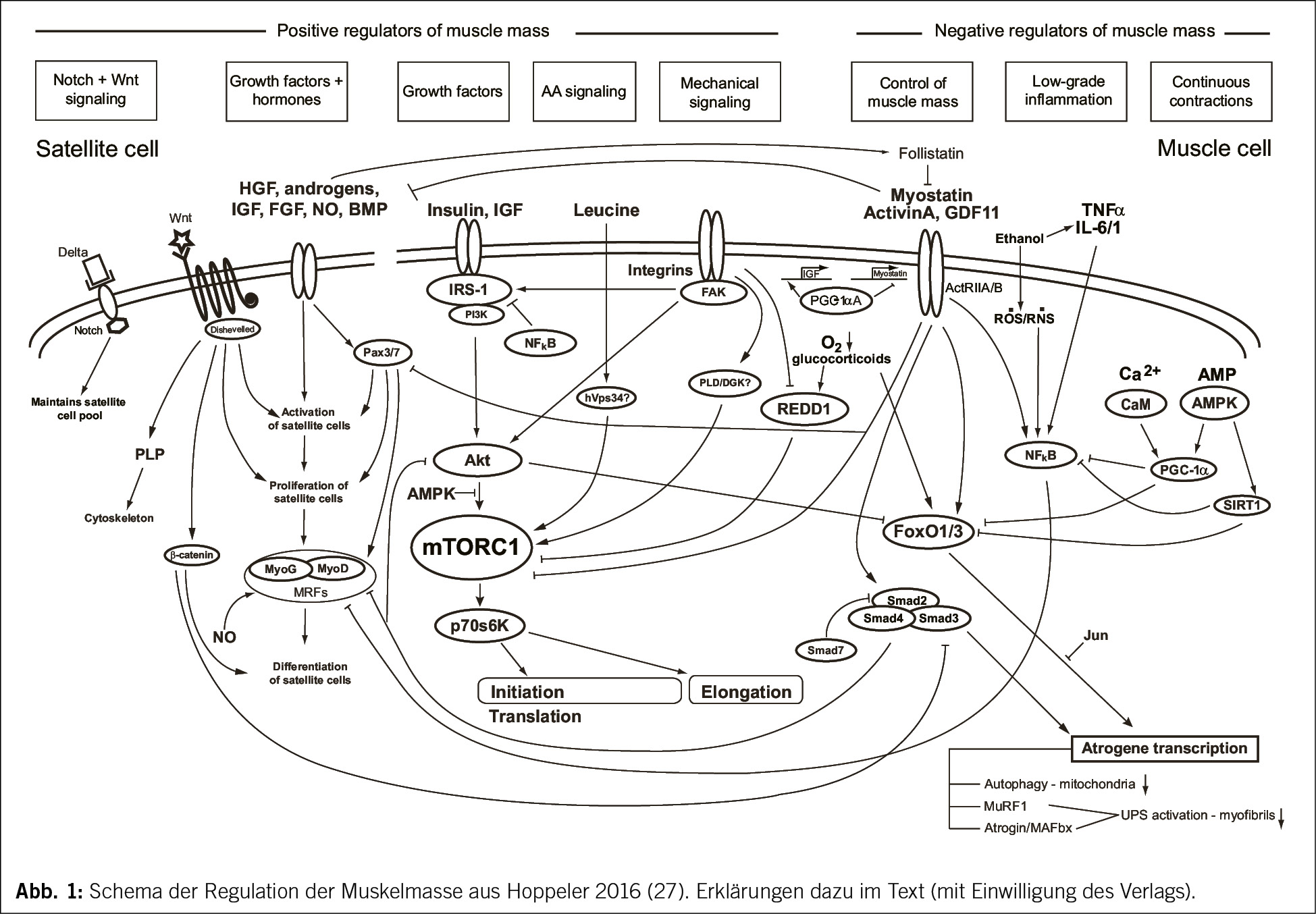 Mit den beschriebenen Tätigkeiten, auch wenn im erforderlichen Umfange betrieben, bleibt das Problem der Sarkopenie nur teilweise gelöst. Auch bei adäquater körperlicher Tätigkeit wird im Alter ein Verlust an Muskelmasse stattfinden und den Leistungszerfall beschleunigen. Der Begriff Sarkopenie wurde von Rosenberg (7) geprägt und bezeichnet im engeren Sinne den altersbedingten Verlust an Muskelmasse und Funktion. Rosenberg nennt als Ätiologie für Sarkopenie: Bewegungsarmut, vermehrtes Muskelfett, Insulin Resistenz, Verlust an Motoneuronen, verminderte Proteinaufnahme, erhöhtes Interleukin-6, Abnahme an Östrogen und Testosteron sowie verminderte Abgabe von Wachstumshormon (8). Die genannte Ätiologie benennt damit im Wesentlichen die bekannten positiven und negativen Regulatoren der Muskelmasse (Abb. 1).