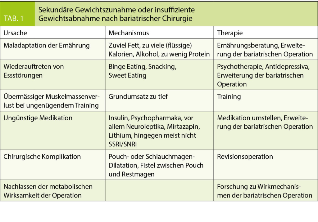 Eine Übersicht über die Faktoren und Behandlungsansätze bei ungenügender Abnahme oder verstärkter sekundärer Gewichtszunahme gibt die Tabelle 1.