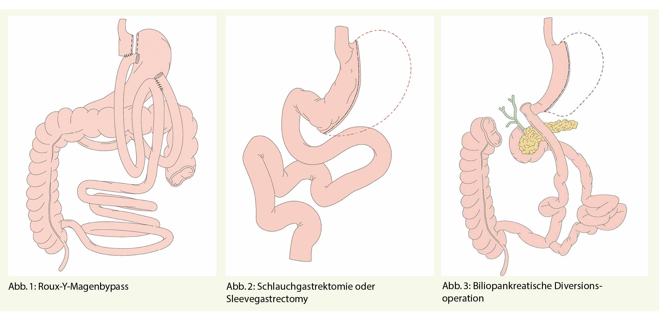 Die am häufigsten durchgeführte Operation ist der Magenbypass, meist in Form des proximalen Roux-Y-Magenbypasses (Abb. 1), welcher sowohl restriktiv wie auch malabsorptiv wirkt. Vor allem restriktiv wirkt die Schlauchgastrektomie oder Sleevegastrectomy (Abb. 2), sowie das Magenband, welches bis 2005 die Standardoperation darstellte, heute aber wegen Intoleranz, im Sinne von Oesophagusdysmotilität und Refluxsymptomen nicht mehr eingelegt wird. Die stärkste Gewichtsabnahme erfolgt nach der biliopankreatischen Diversionsoperation (Abb. 3). Diese Operation führt zu einer starken Malabsorption. Alle Operationen wirken auch über eine Veränderung der neuro-enterohumoralen Komponenten, d.h. über eine Veränderung der gastrointestinalen Peptidhormone und über eine Beeinflussung von zentralen Regelkreisen zur Regulierung von Sättigung und Belohnung. Auch die Veränderung der Microbiota nach den Operationen spielt eine Rolle in der Gewichtsreduktion.