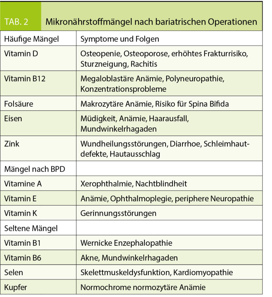 Die wichtigsten Mängel nach bariatrischen Operationen, inklusive Symptomen und Folgen sind in Tabelle 2 zusammengestellt.