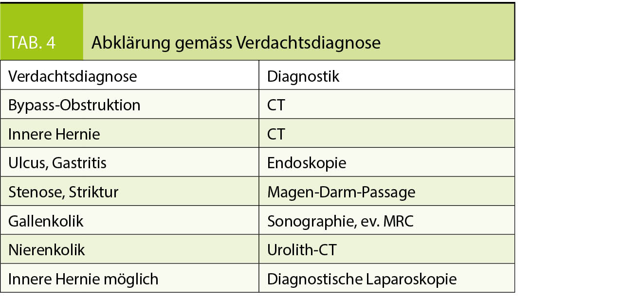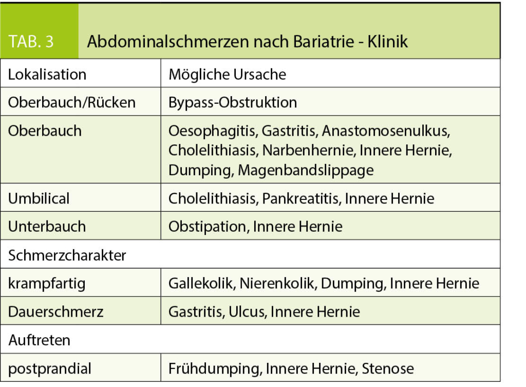 Die Ursache von Schmerzen ist vielfältig, in der Regel sind eine genaue Anamnese und die klinische Untersuchung hilfreich und richtungsweisend. Eine genaue Abklärung ist wichtig, um mögliche gravierende Komplikationen nicht zu verpassen. Tabelle 3 zeigt die Differentialdiagnose von Abdominalschmerzen nach bariatrischen Operationen.