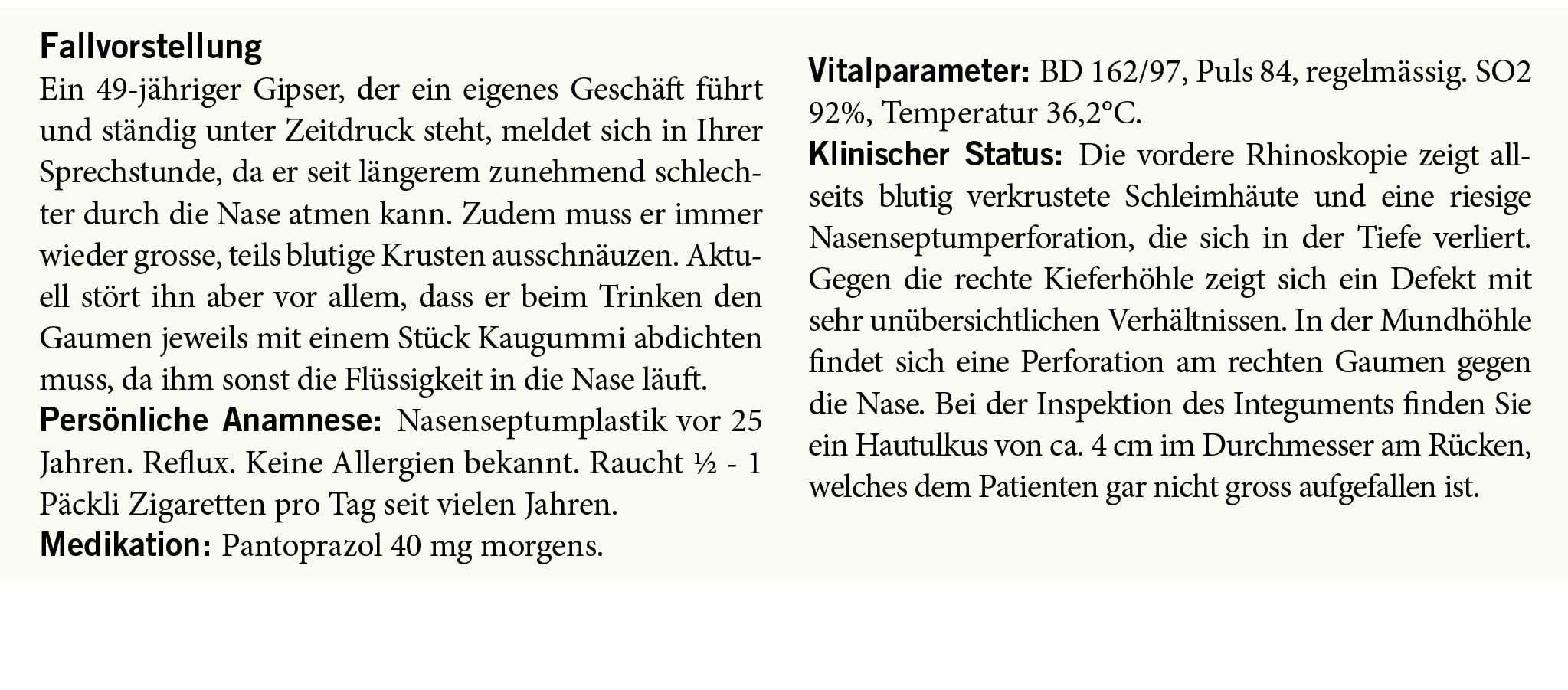 Antwort: Richtig sind alle Antworten. Aus der er­gänzenden Anamnese erfahren Sie bei genauerem Nachfragen, dass der Patient regelmässig Kokain konsumiert. Bei der Vermutung einer Granulomatose lassen Sie in den Laboruntersuchungen unter anderem die ANCAs bestimmen. Da die Verhältnisse in der Nase sehr unübersichtlich sind und grosse Destruktionen vorliegen, veranlassen Sie eine Bildgebung, wobei neben der Computertomographie auch ein MRI möglich wäre. Zur Entnahme von endoskopisch kontrollierten, gezielten Schleimhautbiopsien in Oberflächenanästhesie überweisen Sie den Patienten an eine ORL-Fachärztin, mit welcher Sie regelmässig zusammenarbeiten. Zehn Tage später kommt der Patient wie geplant zu Ihnen in die Sprechstunde, um die Resultate zu besprechen. Sie erklären ihm den Radiologiebefund und informieren ihn über die Laborresultate. Hier fallen die positiven c-ANCA auf. Die Histologie zeigt eine chronische Entzündung mit Granulomen.
