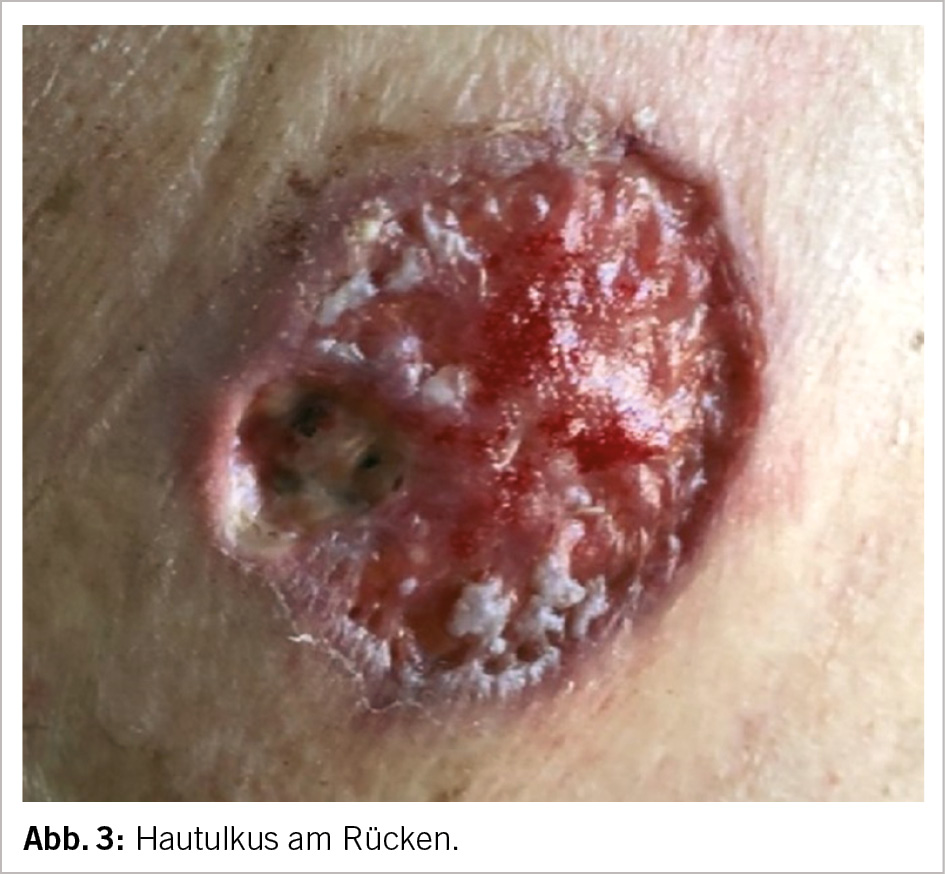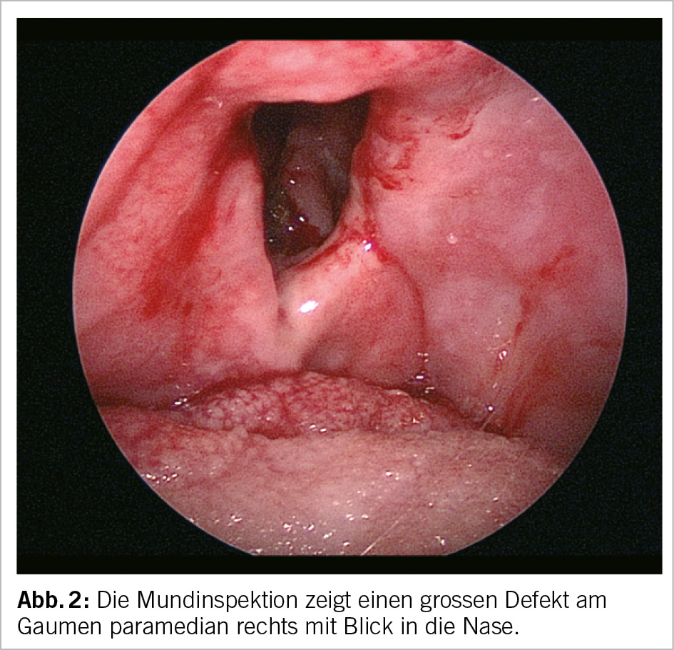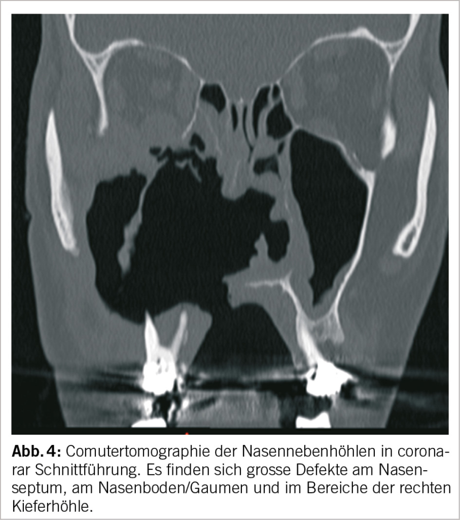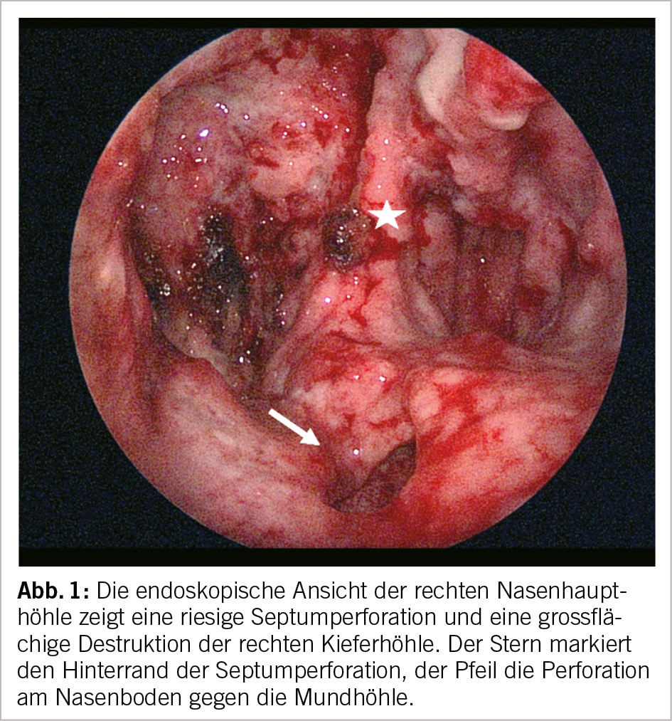 Bei unserem Patienten mit regelmässigem Kokainabusus liegt eine toxische Ursache dieser grossflächigen Destruktionen in der Nase, der Kieferhöhle und des Gaumens vor. Wie aktuelle Abwasseruntersuchungen zeigen, ist der Konsum von Kokain in der Schweiz weit verbreitet und muss bei Läsionen in der Nase gezielt erfragt werden. Kokain führt einerseits selbst zu einer ANCA-assoziierten Vaskulitis, welche oft schwierig von einer Granulomatose mit Polyangiitis zu differenzieren ist. Beide weisen im Labor nämlich positive c-ANCA auf. Hier kann neben der Anamnese die Bestimmung der Anti-Elastase-Antikörper weiterhelfen. Andererseits ist Kokain häufig mit Levimasol gestreckt. Levamisol ist ein Antihelminthikum, welches in der Veterinärmedizin eingesetzt wird. Zudem hat es eine immunmodulierende Wirkung und soll auch leicht euphorisierend wirken. Als Nebenwirkung kann es zu Haut- und Schleimhautnekrosen führen. So zeigt auch unser Patient neben den eindrücklichen Befunden in der Nase eine Hautnekrose am Rücken.