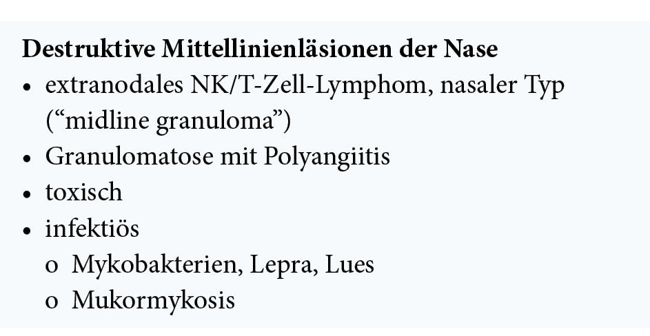 Die Differentialdiagnose von destruktiven Läsionen in der Mittellinie in der Nase zeigt diese Tabelle: