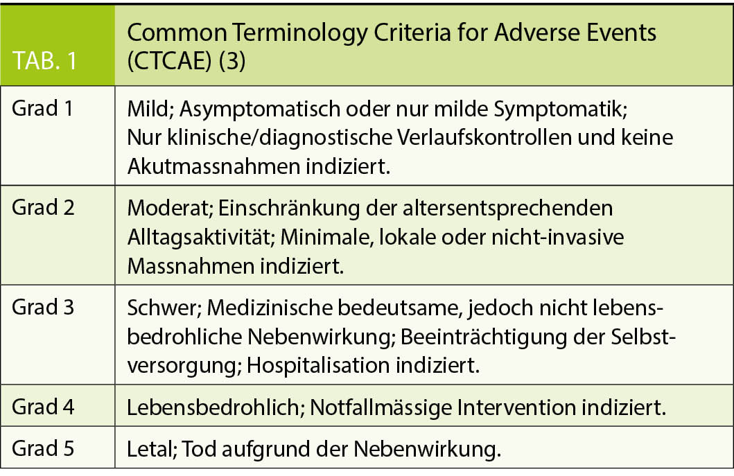 Eine weitere wichtige Unterscheidung bei Nebenwirkungen onkologischer Therapien ist die Frage der Dauer bzw. Reversibilität. Während viele Symptome akut toxischer Natur sind, gibt es auch kumulative Toxizitäten, die eher verzögert, längerfristig und manchmal auch irreversibel auftreten. Dies ist zum Beispiel bei der Oxaliplatin-bedingten Neurotoxizität der Fall, die oftmals erst nach einigen Monaten oder sogar nach Beendigung der Therapie auftritt und zu einer deutlichen Alltagsbeeinträchtigung führen kann (2). Zur Klassifikation der Art und Schwere von Nebenwirkungen werden in der Onkologie die sogenannten CTCAE (Common Terminology Criteria for Adverse Events) des National Institute of Health angewendet (3). Die Schwere von Nebenwirkungen wird hier in jeweils 5 Grade eingeteilt (Tabelle 1). Klinisch relevant sind in der Regel erst zweit- und drittgradige Nebenwirkungen, da sie häufig eine Pausierung bzw. Dosisanpassung der Chemotherapie erfordern und nicht selten auch behandelt werden müssen. Dies kann gut am Beispiel der Diarrhoe gezeigt werden. Ab einer zweitgradigen Diarrhoe (definiert als 4-6 wässrige Stuhlgänge pro Tag) besteht eine gewisse Alltagseinschränkung des Patienten. Ab einer drittgradigen Diarrhoe (definiert als > 7 wässrige Stuhlgänge pro Tag) ist ein relevanter Flüssigkeitsverlust wahrscheinlich und eine Hospitalisation sollte erwogen werden. In Tabelle 2 sind onkologische Notfälle zusammengestellt, die im Allgemeinen eine Spitalzuweisung erfordern.
