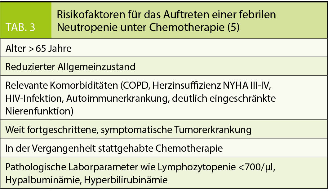 Zu den häufigsten Nebenwirkungen einer Chemotherapie jeglicher Art zählen sicherlich Veränderungen des Blutbildes und gastrointestinale Beschwerden wie z.B. Diarrhoe und Nausea. Der Grund hierfür liegt in dem allgemeinen Wirkprinzip der Proliferationshemmung, wodurch sich laufend regenerierende Organe wie etwa die gastrointestinale Mukosa oder das hämatopoetische System gleichermassen mitbetroffen sind wie der Tumor. Aufgrund der Häufigkeit dieser Nebenwirkungen ist es sinnvoll, dass auch den behandelnden Hausärzten geläufig ist, wie man mit ihnen umgehen sollte. Eine gute Hilfestellung bieten diesbezüglich die frei zugänglichen Praxis-Guidelines der europäischen Gesellschaft für medizinische Onkologie (ESMO) sowie die S3 Leitlinie zur supportiven Therapie der DGHO (4, 5). Zudem gibt es eine hilfreiche Gratisbroschüre der Krebsliga Schweiz zum Thema medikamentöser Tumortherapien, die man gut als Ratgeber an Patienten und Angehörige abgeben kann (6). Zur Behandlung der Chemotherapie-bedingten Diarrhoe werden beispielsweise supportive Massnahmen wie auch Antidiarrhoika wie Loperamid eingesetzt. Ein weiteres gutes Beispiel ist die Neutropenie. Eine passagere Neutropenie ist eine zu erwartende Nebenwirkung sehr vieler Chemotherapien. Man unterscheidet zwischen einer moderaten Neutropenie (Neutrophile zwischen 500 und 1000 / μl) und einer schweren Neutropenie (Neutrophile < 500 / μl). Grundsätzlich erfordert die Neutropenie keine zwingenden Massnahmen. Jedoch sollten dem behandelnden Onkologen Labormesswerte mit Nachweis einer Neutropenie mitgeteilt werden. Wenn ein hohes Risiko für eine febrile Neutropenie besteht, wird durch den behandelnden Onkologen bereits bei der Planung der Chemotherapie der Einsatz von G-CSF erwogen. Für die Beurteilung des Infektrisikos ist zudem die Dauer der Neutropenie von Bedeutung. Das Risiko steigt insbesondere, wenn diese länger als eine Woche anhält. Weitere Risikofaktoren für das Auftreten einer febrilen Neutropenie sind in Tabelle 3 aufgezählt. Eine febrile Neutropenie, also das Zusammentreffen von Neutropenie und Fieber (> 38,5°C oder > 38°C zweimal peripher gemessen), ist ein onkologischer Notfall und erfordert eine sofortige Spitalzuweisung, Infekt-Diagnostik und Behandlung mit einem Breitbandantibiotikum. Grundsätzlich gilt Fieber bei Patienten unter Chemotherapie daher als Alarmsignal, und sollte stets unmittelbar abgeklärt werden.