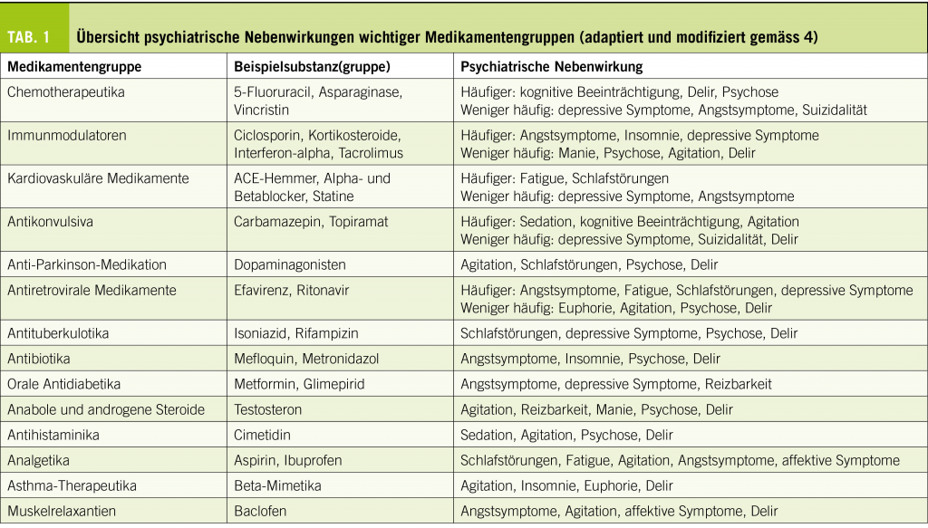 Psychiatrische Symptome können als Nebenwirkungen von Medikamenten auftreten, welche zur Behandlung somatischer Erkrankungen eingesetzt werden. Diese sind klinisch kaum zu unterscheiden von psychiatrischen Symptomen als Ausdruck von psychiatrischen Erkrankungen im engeren Sinne und stellen eine grosse diagnostische und therapeutische Herausforderung für den Behandler dar.