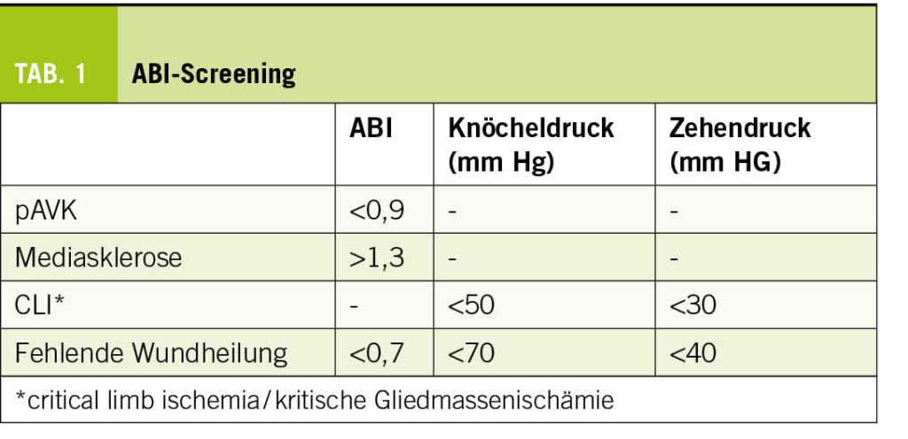 Da die PAVK-Prognose relevant ist bezüglich MACE (Stroke, MI, cv-Tod) und MALE (major adverse limb events) und oft maskiert auftritt, ist ein ABI-Screening im Liegen nach 10 Min. Ruhe bei
