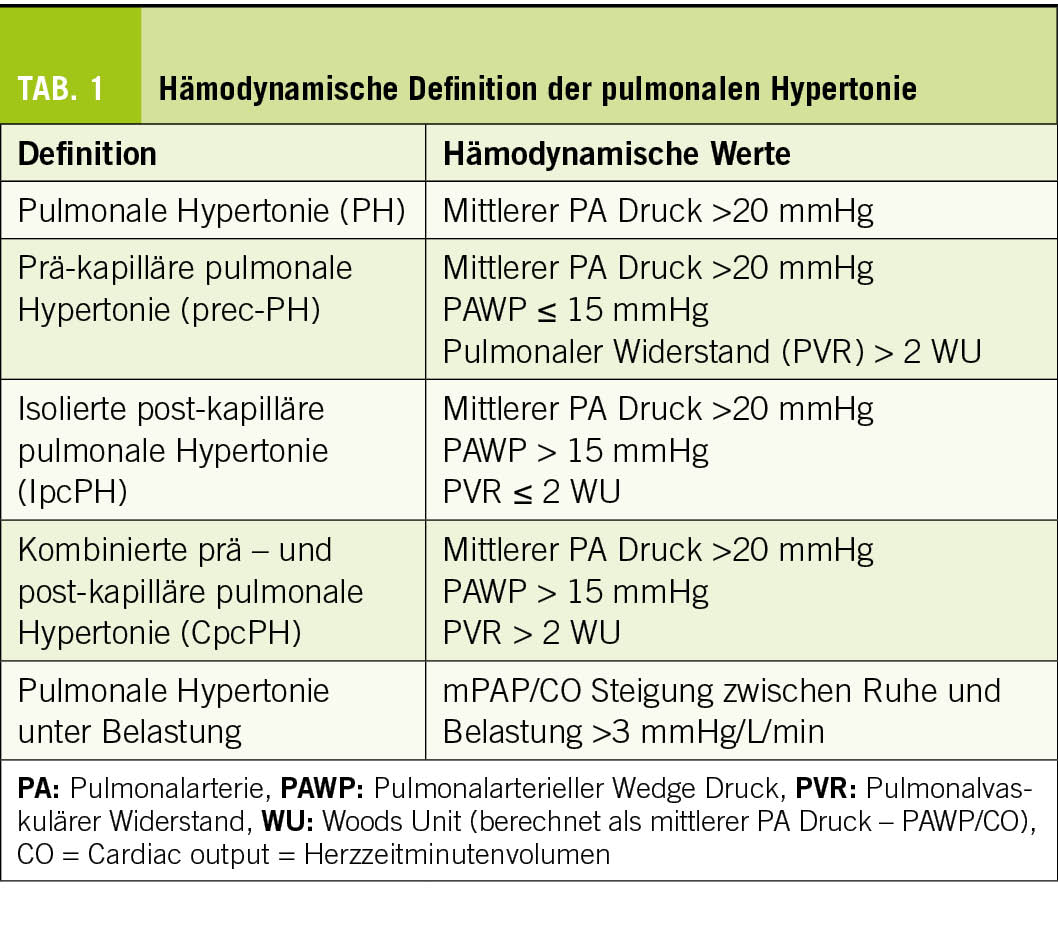 Eine der wichtigsten Neuerungen ist die neue hämodynamische Definition der PH. Die Schwelle von 25 mmHg für den mittleren pulmonalen Druck (mPAP) wurde auf 20 mmHg gesenkt (Tab. 1). Diese Definition wurde am sechsten Weltsymposium für PH erarbeitet und jetzt von den Fachgesellschaften in ihre Richtlinien übernommen (2). Diese tiefere Grenze des (mPAP) von <20 mmHg wird damit begründet, dass ein normaler pulmonaler Druck noch tiefer liegt und dass eine Erhöhung des mittleren PA-Druckes >20 mmHg zu einer schlechten Prognose im Langzeitverlauf bei der idiopathischen und der chronisch thrombo-embolischen pulmonalen Hypertonie führt. Die prä-kapilläre und die post-kapilläre PH werden unterschieden aufgrund des mittleren pulmonalarteriellen Wedge Druckes (PAWP) und des pulmonalvaskulären Widerstands (PVR) gemessen mittels Wood Units (PVR in WU= mittlerer pulmonaler Druck – PAWP geteilt durch das Herzzeitminutenvolumen). Beträgt der PAWP ≤15 mmHg und der PVR >2 Woods Units handelt es sich um eine präkapilläre PH. Beträgt der PAWP >15 mmHg und der PVR ≤2 Wood Units, so liegt eine post-kapilläre PH vor. Gegenüber 2015 wird also der PVR wieder zur Klassifikation der PH verwendet. Hingegen ist die noch in den 2015 verwendete Identifizierung der reinen präkapillären PH mittels des diastolischen Druckgradienten (diastolischer pulmonal-arterieller Druck – mittlerer PAWP) von 7 mmHg fallen gelassen worden. Die kombinierte prä- und post-kapilläre pulmonale Hypertonie wird neu mit einem PVR von >2 WU definiert (Tab. 1). Wichtig ist zu bemerken, dass die neue Schwelle für die Definition einer PH die Empfehlungen für den Therapiebeginn nicht beeinflusst haben. Es gibt nämlich keine Evidenz für die Wirksamkeit einer spezifischen Therapie bei mPAP-Werten <25 mmHg.