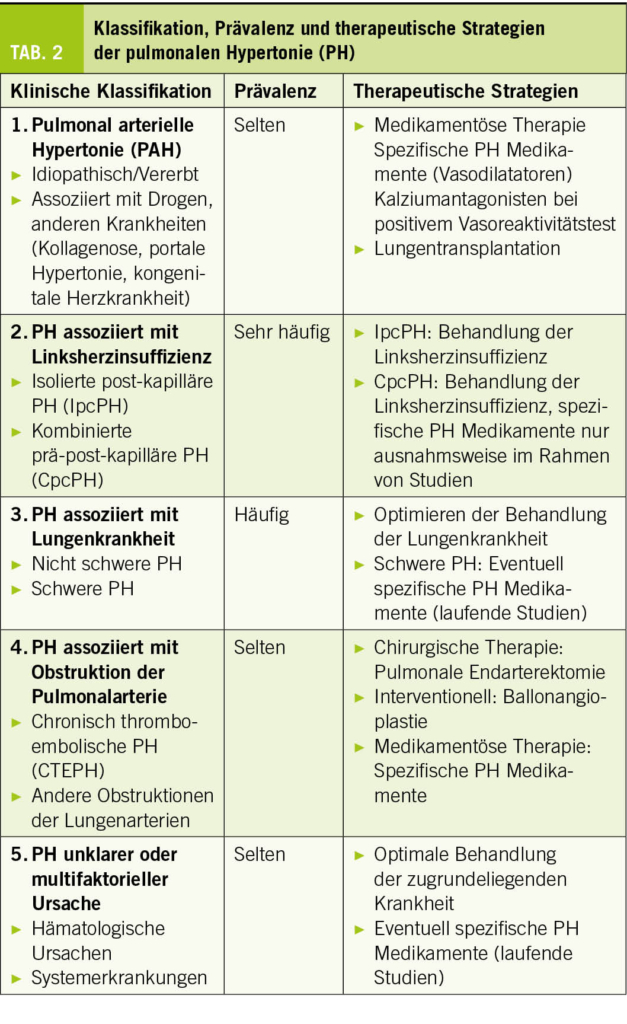 Die Behandlung der PH richtet sich nach deren Ätiologie (Tab. 2). Für die Patienten mit pulmonal-arterieller Hypertonie der Gruppe 1 (idiopathische PH, vererbte PH, PH assoziiert mit Medikamenten, Drogen, anderen Krankheiten) stehen die spezifischen vasodilatierenden Medikamente, welche über die Endothelin, die NO oder die Prostazyklin vermittelte Vasodilatation wirken, zur Verfügung. Neu wird die Therapie aufgrund des Vorliegens von anderen kardiopulmonalen Komorbiditäten modifiziert. Wenn andere kardiopulmonale Erkrankungen vorliegen, wird primär eine Monotherapie eingesetzt, wenn nicht, wird empfohlen die PH-Medikamente von Anfang an in einer Zweierkombination zu verabreichen. Beim Vorliegen eines hohen Risikos soll rasch eine Dreiertherapie begonnen werden (mit zusätzlich i.v. oder subkutan Prostazyklin Analogen). Nach 3-6 Monaten soll die Therapie überprüft und angepasst werden aufgrund einer neuen Risikoevaluation, welche die Veränderung der Dyspnoe, des 6-Minuten-Gehtests und des natriuretischen Peptids beinhaltet.