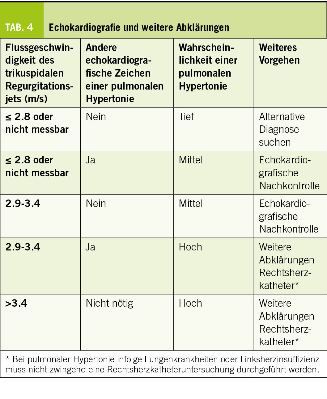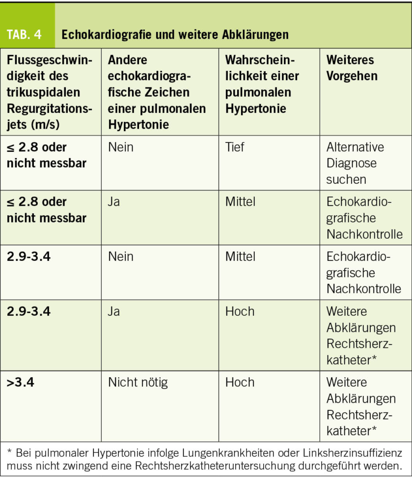 Es gibt aufgrund der multiplen Ätiologien für eine PH keinen einzelnen echokardiografischen Parameter, aufgrund dessen die Diagnose einer PH zweifelsfrei gestellt werden kann. Vielmehr erlaubt die Echokardiografie mittels Messen der Flussgeschwindigkeit des trikuspidalen Regurgitationsjets (TVR) und einer sorgfältigen Suche der indirekten Zeichen einer PH die Wahrscheinlichkeit der Diagnose PH anzugeben (Tab. 4 und 5). Geschwindigkeiten <2,8 m/s sprechen gegen und Geschwindigkeiten >3,4 m/s für das Vorliegen einer PH (Tab. 4). Aus der TVR lässt sich der systolische pulmonale Druck abschätzen (TVR2x4). Dazu müsste aber der rechts-atriale Füllungsdruck bekannt sein, respektive abgeschätzt werden. Da die Abschätzung des Füllungsdrucks sehr variable Werte ergibt, empfehlen die Guidelines, dass nicht der geschätzte systolische Pulmonaldruck, sondern alleine die Geschwindigkeit des TVR zur Beurteilung der Wahrscheinlichkeit einer PH verwendet wird.