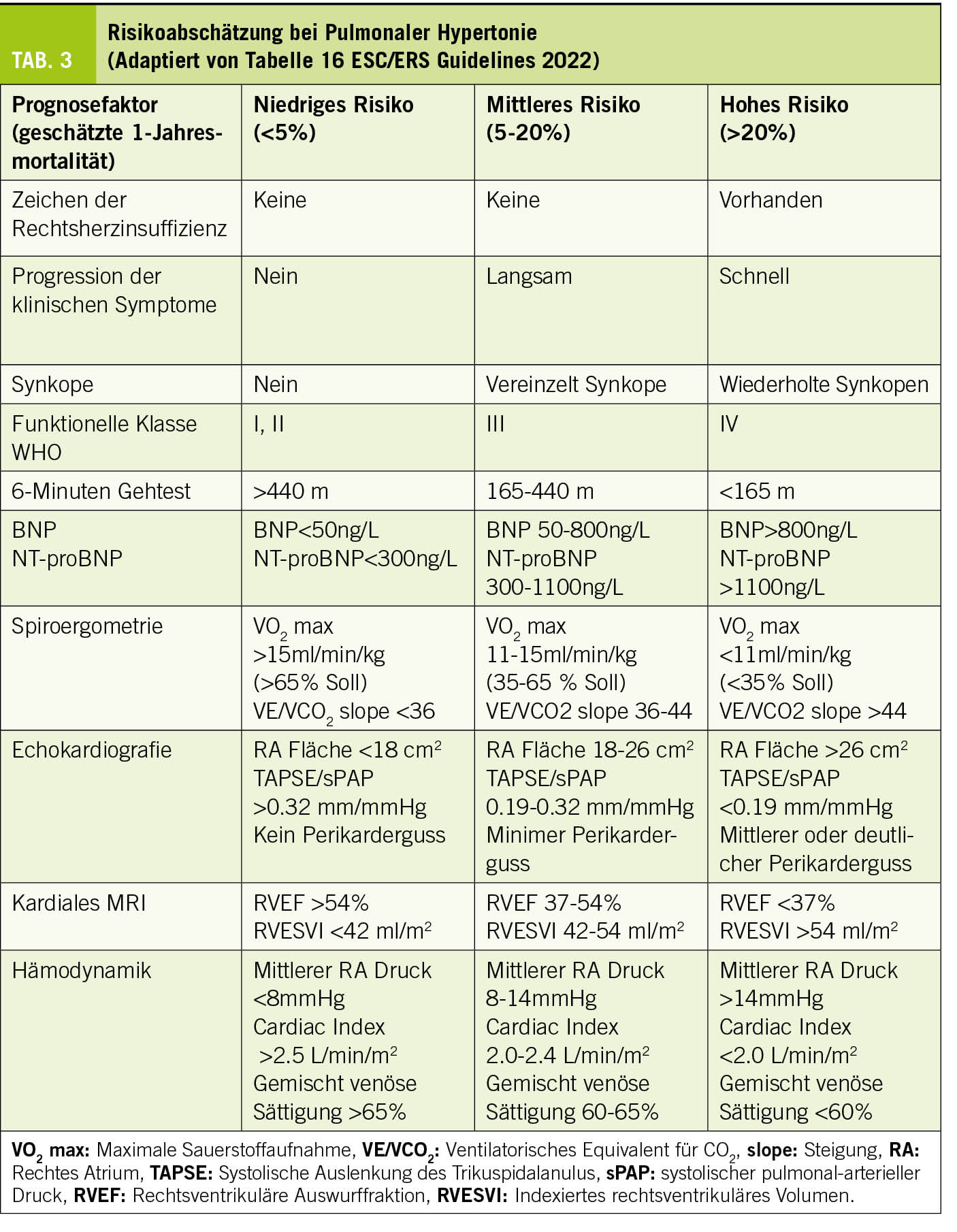 Einhergehend mit der Diagnosestellung in der Spezialsprechstunde für PH muss die Ätiologie durch verschiedene Spezialuntersuchungen eruiert werden. Im Anschluss daran soll eine Risikostratifizierung erfolgen (Tab. 3). Die Risikostratifizierung ist in den neuen Guidelines verfeinert und ausgedehnt worden. Diese Risikostratifizierung ist gut validiert für Patienten mit pulmonal-arterieller Hypertonie (Gruppe 1). Für die anderen Ätiologie besteht keine vergleichbare zuverlässige Risikoabschätzung. Es wird zwischen einem tiefen (Mortalitätsrisiko innerhalb eines Jahres <5%), einem mittleren (Mortalitätsrisiko 5-20%) und einem hohen Risiko (Mortalität >20% innert einem Jahr) unterschieden. Neben den klinischen Symptomen und Zeichen wird das Risiko mittels der funktionellen Tests (6-Minuten-Gehtest, Spiroergometrie), dem natriuretischen Peptid, der invasiv gemessenen Hämodynamik und neu auch mittels der Befunde im MRI festgelegt. Von den echokardiografischen Parametern (5) werden neu auch die Werte der systolischen Auslenkung des Trikuspidalanulus (TAPSE) einbezogen. Das Risiko an der PH zu versterben, bestimmt die Intensität der initialen Behandlung.