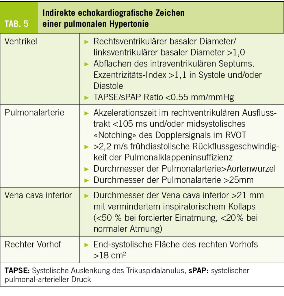 Zusätzlich zur Flussgeschwindigkeit des TVR Jets geben die indirekten Zeichen für eine PH Hinweise für die Wahrscheinlichkeit einer PH. Neu wird die Bewegung des Trikuspidalanulus als Mass für die Kontraktion des rechten Ventrikels, als indirektes Zeichen in die Empfehlungen aufgenommen. Dabei wird die tricuspidal anulus plane systolic excursion (TAPSE) gemessen und dem systolischen Pulmonaldruck gegenübergestellt. Wenn das Verhältnis TAPSE/sPAP <0.55mm/mm beträgt, spricht das für das Vorliegen einer PH (Tab. 5).