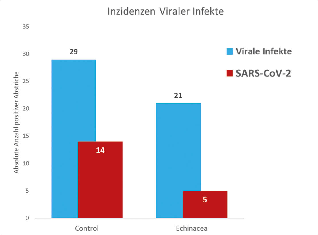Die Zeit bis Patienten wieder Virus-negativ getestet wurden, verkürzte sich insgesamt um 8,0 Tage (p = 0,02) und um 4,8 Tage bei SARS-CoV-2 (p > 0,05) im Vergleich zur Kontrollgruppe. Schliesslich führte die EF-Behandlung zu einer signifikanten Verringerung der Fiebertage (11 Tage im Vergleich zu 1 Tag, p = 0,003), nicht aber der Gesamt­symptomatik, was mit dem ungleichen Verbrauch an Co-Medikation zu tun haben könnte. Unter Echinacea kam es zu weniger Covid-19 Hospitalisationen, wobei der Unterschied nicht statistisch signifikant war (N = 0 vs. N = 2).