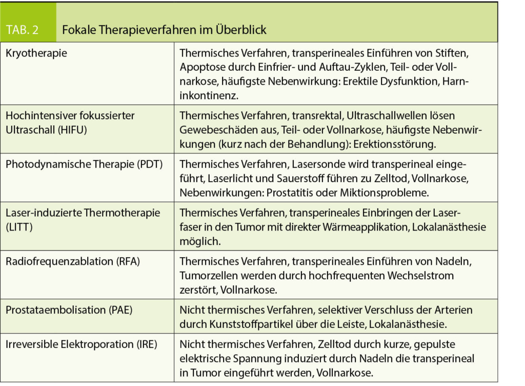 Der Hauptzweck der Fokaltherapie besteht darin, Tumore selektiv abzutragen und gleichzeitig die Toxizität zu begrenzen, indem die neurovaskulären Bündel der Prostata, der Schliessmuskel und die Harnröhre geschont werden (Tab. 2) (9, 10).