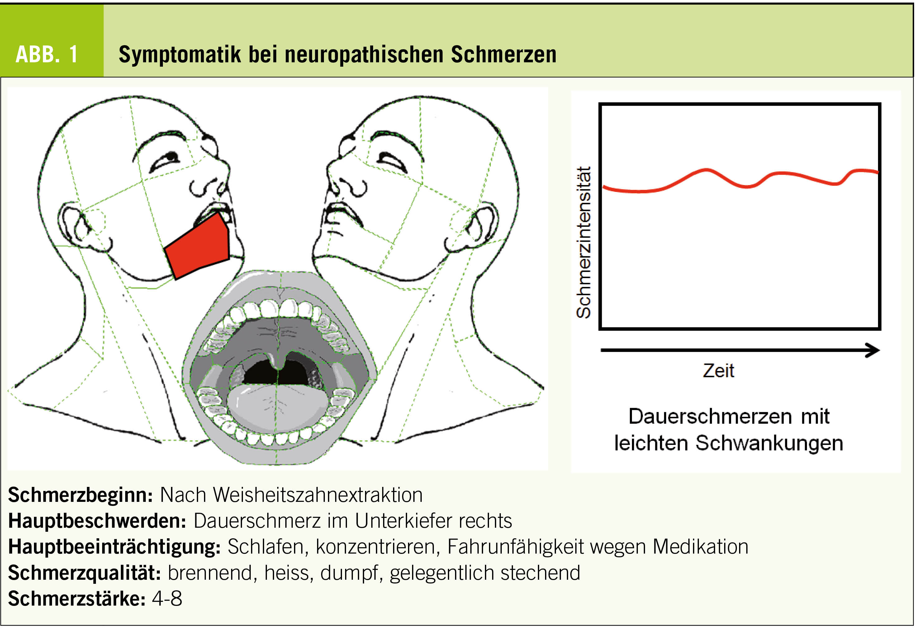 Anhaltenden neuropathischen Mund- und Gesichtsschmerzen geht fast immer ein Trauma voran. Gemäss einer prospektiven klinischen Studie leiden ca. 10% der Personen, die eine Zahnwurzelbehandlung benötigten – also einen auf den Zahnnerv beschränkten Eingriff – noch nach 6 Monaten an persistierenden Schmerzen (15). Das zur Zahnabdichtung notwendige Füllmaterial verhindert die normale Nervenregeneration und fördert dadurch die Entstehung von Mikroneuromen (9). Der Schmerzcharakter hat gemäss den oben beschriebenen molekularen Mechanismen meist einen brennenden Anteil.