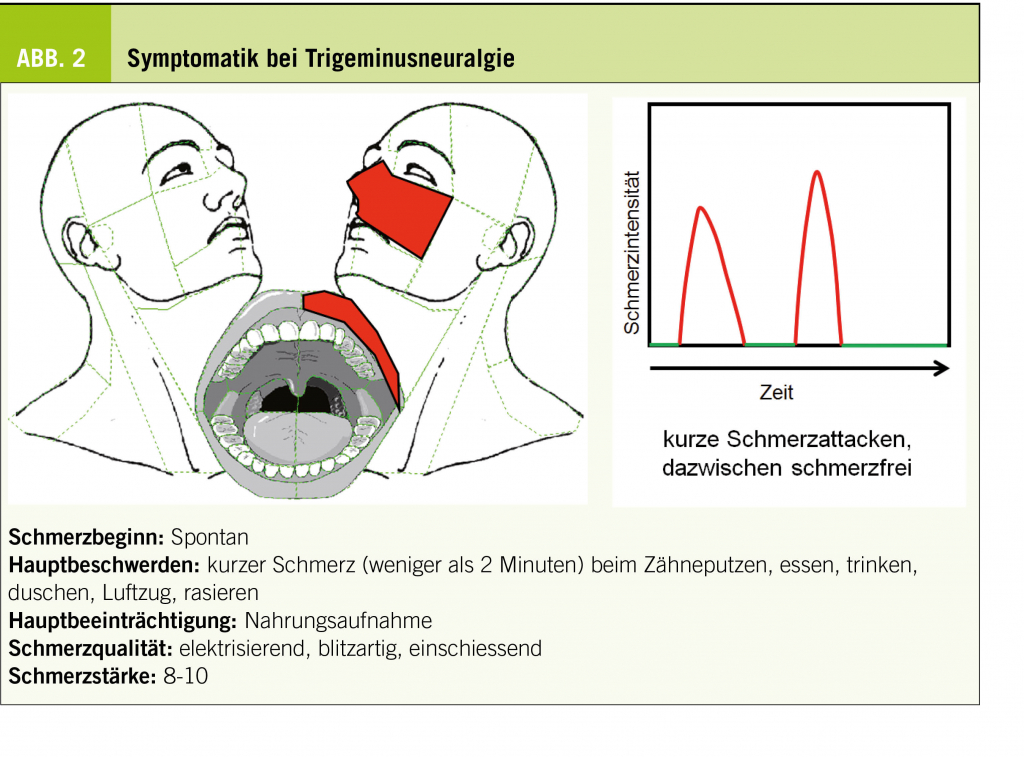 Die Trigeminusneuralgie kann in jedem Alter auftreten, betrifft aber überwiegend Personen älter als 60 Jahre. Die Inzidenz beträgt ca. 3-5/100 000 Einwohner. Der charakteristische Schmerz der Trigeminus-Neuralgie ist dem lokalen Verlust von Myelin zuzuschreiben, welches normalerweise die rasche Signalleitung auf taktile Fasern beschränkt. Wenn das schnelle neurale Signal am Ort des Myelinschadens (meist nahe dem Hirnstamm) vom taktilen aufs schmerzleitende System überspringen kann, entstehen neuralgiforme Schmerzen (5). Die Krankheit ist charakterisiert durch kurzzeitige (Sekunden bis max. 2 min) attackenartige Gesichtsschmerzen von hoher bis höchster Intensität, welche als elektrisierend, blitzartig und einschiessend beschrieben werden. Typische Schmerzauslöser sind leichte Berührungsreize wie Windzug, Schminken, Zähneputzen, Rasieren, aber auch Alltagsaktivitäten wie Sprechen und Schlucken. Spontane Attacken sind möglich, aber eher selten. Dazwischen bestehen schmerzfreie Phasen von variabler Dauer (Abb. 2). Die Schmerzen sind strikt im Innervationsgebiet eines (selten mehrerer) Trigeminusäste lokalisiert (V3 > V2 > V1).