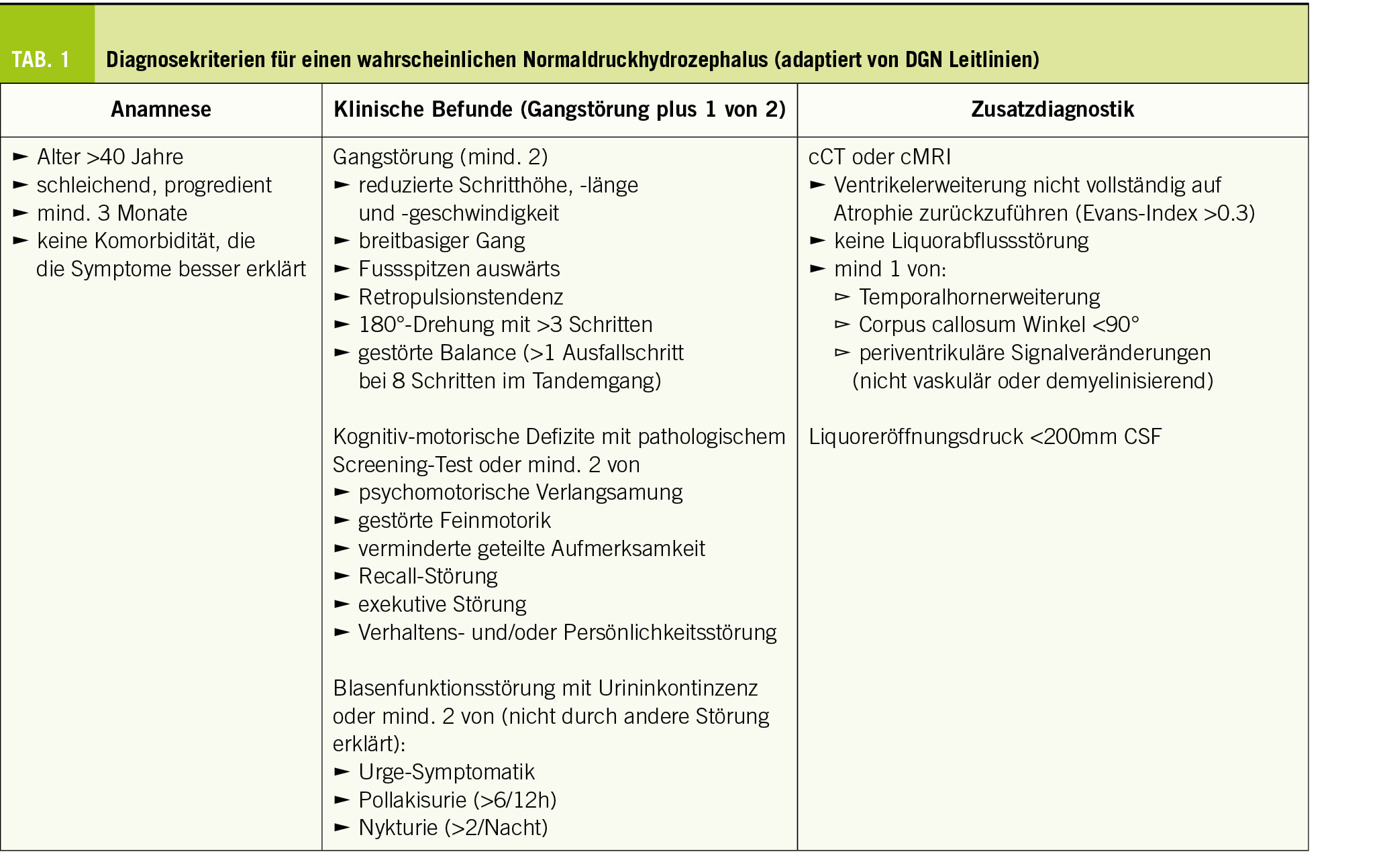 Im Vordergrund der Diagnostik steht natürlich wie immer die passende Anamnese und die klinische Untersuchung. Als entscheidende Zusatzdiagnostik folgt dann eine zerebrale Bildgebung und bei entsprechendem Verdacht auf einen NPH ein Liquorablassversuch (Tab. 1).