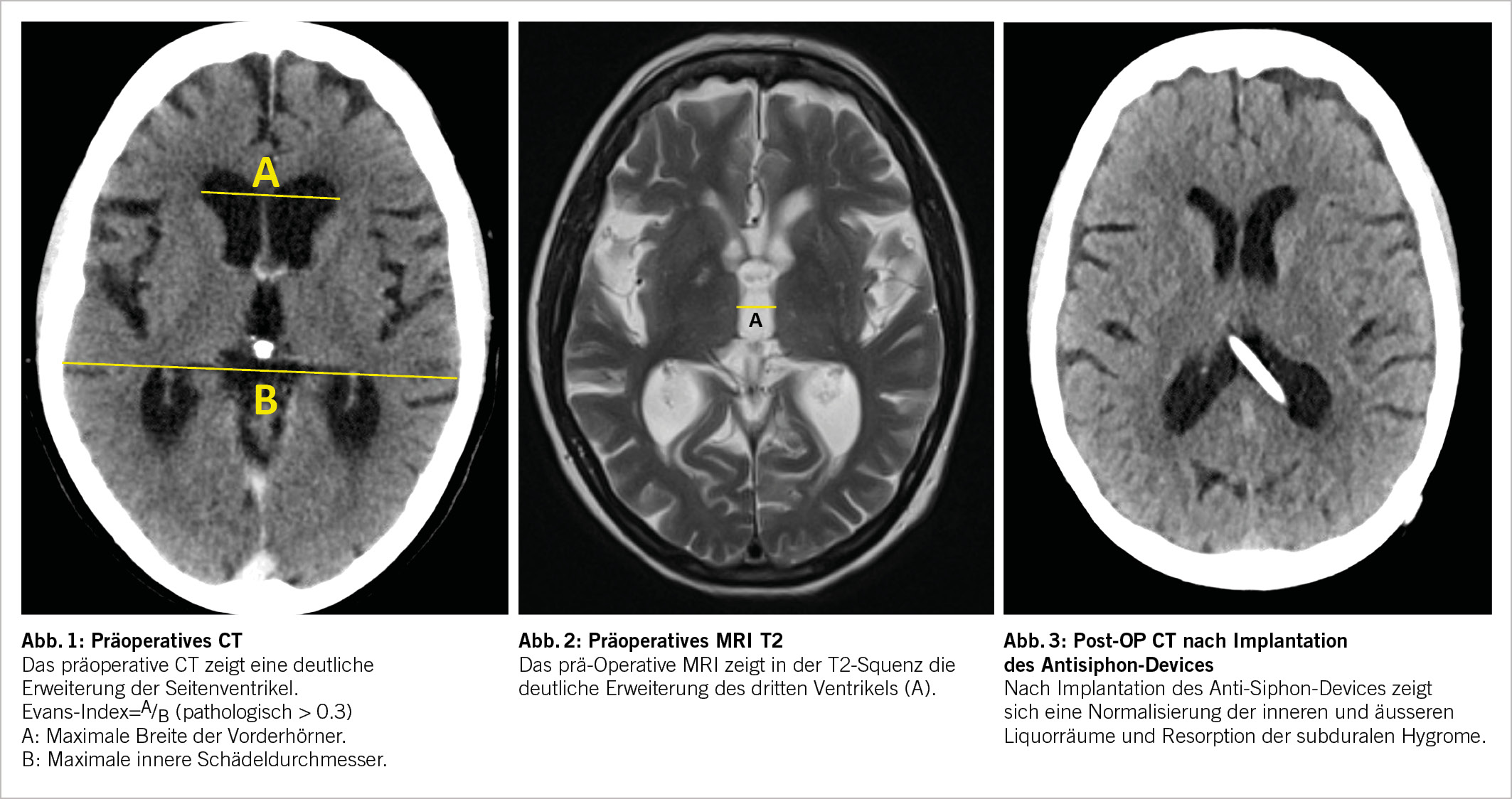 Eine 77-jährige Patientin war lange aufgrund von Rücken- und Beinschmerzen bei degenerativen Veränderungen der Wirbelsäule bei Schmerzmedizinern und Rheumatologen in konservativer Behandlung. Im weiteren Verlauf entwickelte die Patientin eine Gangataxie, die primär auf die Wirbelsäulenveränderungen mit Affektion neuraler Strukturen zurückgeführt wurde. Einige Monate später traten jedoch auch kognitive Störungen mit Einschränkungen des Kurzzeitgedächtnisses hinzu. Anamnestisch wurde auch eine intermittierende Urininkontinenz berichtet, was somit das klassische Bild einer Hakim-Trias vervollständigte. Sodann erfolgte die Vorstellung bei einem neurologischen Kollegen, welcher die bildgebende Diagnostik veranlasste. Das MRI zeigte eine typische Erweiterung aller vier Ventrikel und zusätzliche Zeichen einer beginnenden Liquordiapedese der Vorderhörner in der FLAIR- und T2-Sequenz. Nach zweimaliger Liquor-Punktion und Liquorablassversuch von ca. 35-40 ml Liquor zeigte die Patientin jedoch keine klare Besserung der Symptomatik und es wurden Zweifel an der Diagnose des NPH erhoben. Sieben Monate später wurde die Patientin aufgrund zunehmender Vigilanz-Schwankungen und Zunahme der Gangataxie erneut zugewiesen. Die cerebrale Bildgebung zeigte eine Zunahme der inneren Liquorräume. In der Folge wurde die Indikation zur Einlage einer lumbalen Drainage im Rahmen einer stationären Abklärung gestellt. Ein Tag nach Implantation der lumbalen Drainage (mit einem Fluss von 5-10 ml/Stunde) zeigte die Patientin eine signifikante Besserung des Gangbildes und der Kognition. Nach Entfernung der kontinuierlichen Lumbaldrainge kam es wieder zu einer Verschlechterung der Symptomatik. Damit wurde die Indikation für die VP-Shunt-Einlage gestellt. Der peri- und postoperative Verlauf gestaltete sich komplikationslos und die Patientin konnte im Verlauf bei deutlicher Besserung der Symptomatik, mit selbständigem und sicherem Gang, entlassen werden.