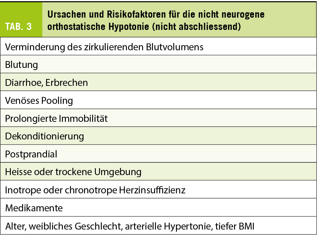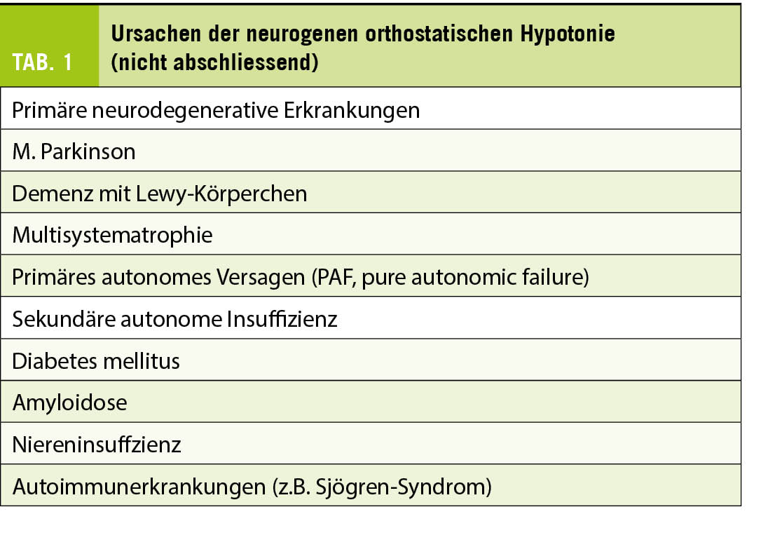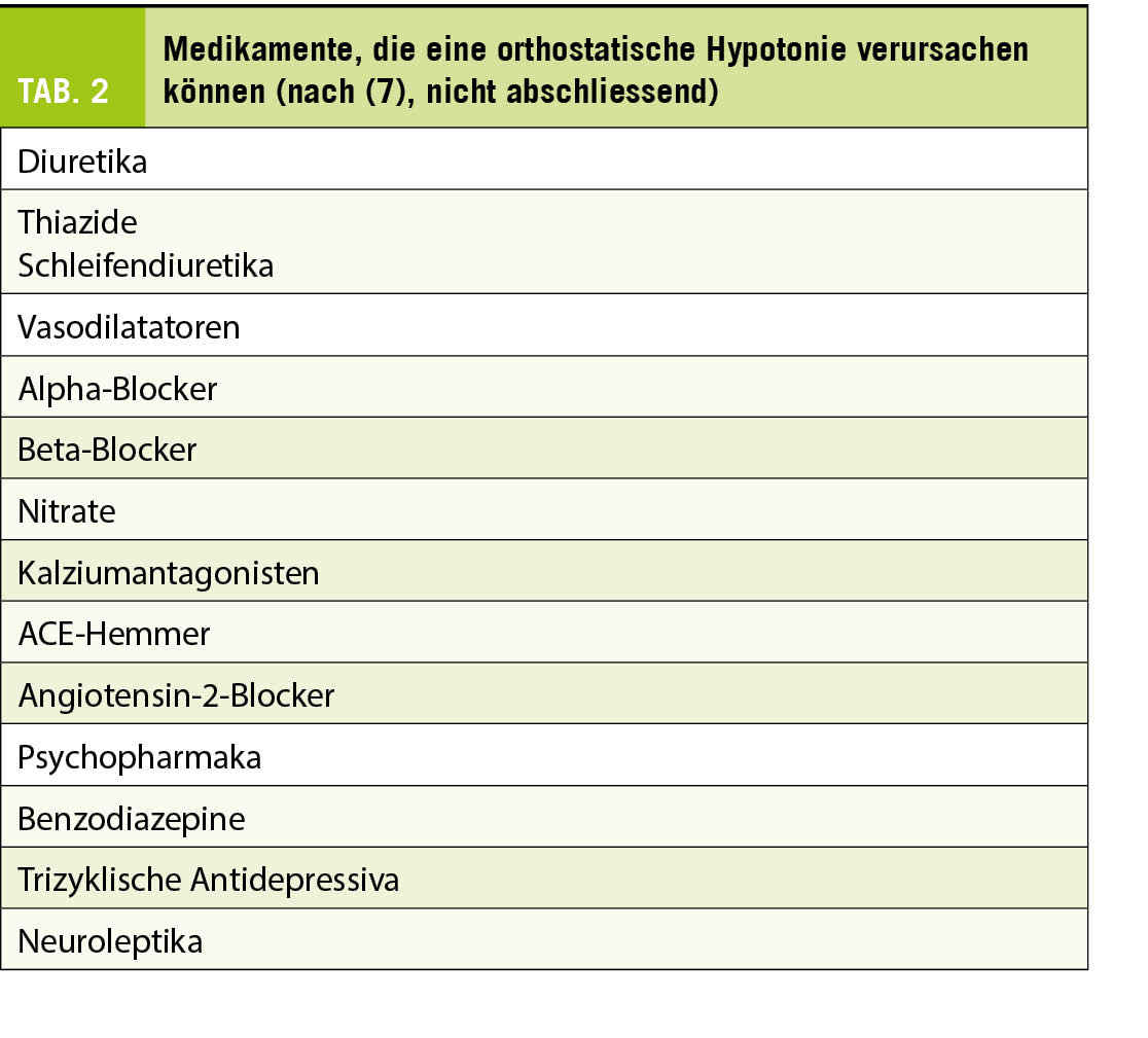 Bei den Ursachen der OH werden einerseits eine primäre (neurodegenerative) und eine sekundäre (Polyneuropathie bei internistischen Grunderkrankungen) Schädigung des autonomen Nervensystems unterschieden (Tab. 1). Andererseits können Medikamente (Tab. 2) und ein inadäquater venöser Rückfluss (Tab. 3) auch bei intaktem autonomem Nervensystem zu einer OH führen.