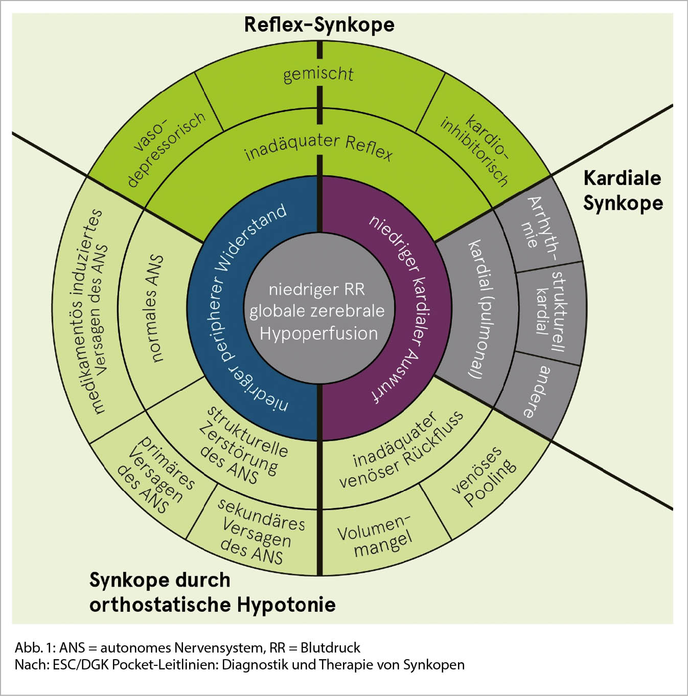 Die Ursachen von Synkopen sind vielfältig und in der Abbildung 1 (adaptiert nach (1)) entsprechend der Pathophysiologie in Reflex-Synkopen, kardiale Synkopen und Synkopen durch orthostatische Hypotonie (OH) unterteilt. Die OH ist ein häufiger Befund bei der Abklärung von Synkopen, schlussendlich jedoch nicht immer deren Ursache (2).