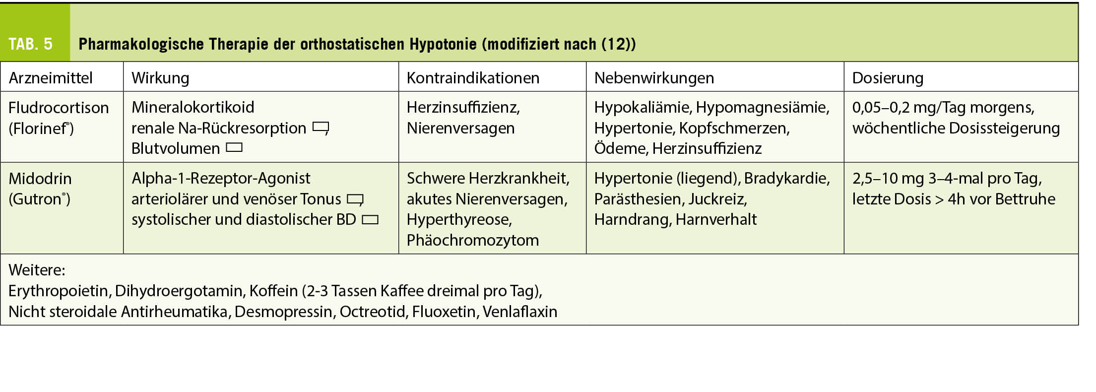 Auch die medikamentöse Therapie (Tab. 5) der orthostatischen Synkopen gestaltet sich bei älteren Menschen mit Begleiterkrankungen schwierig. In erster Linie wird das Mineralokortikoid Fludrocortison allein oder in Kombination mit dem Sympathomimetikum Midodrin eingesetzt, wobei die Evidenz für letzteres besser ist (8, 9).