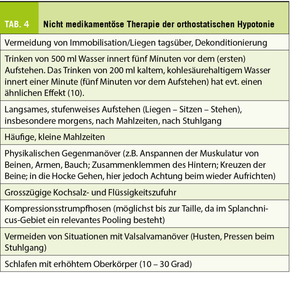 ◆ Grundpfeiler der Behandlung der orthostatischen Hypotonie bilden die nicht medikamentösen Massnahmen (Reduktion / Absetzen von OH auslösender / verstärkender Medikation, grosszügige Kochsalz- und Wasserzufuhr, Schlafen mit erhöhtem Oberkörper, Kompressionsstrumpfhosen, Muskelanspannung, usw.)