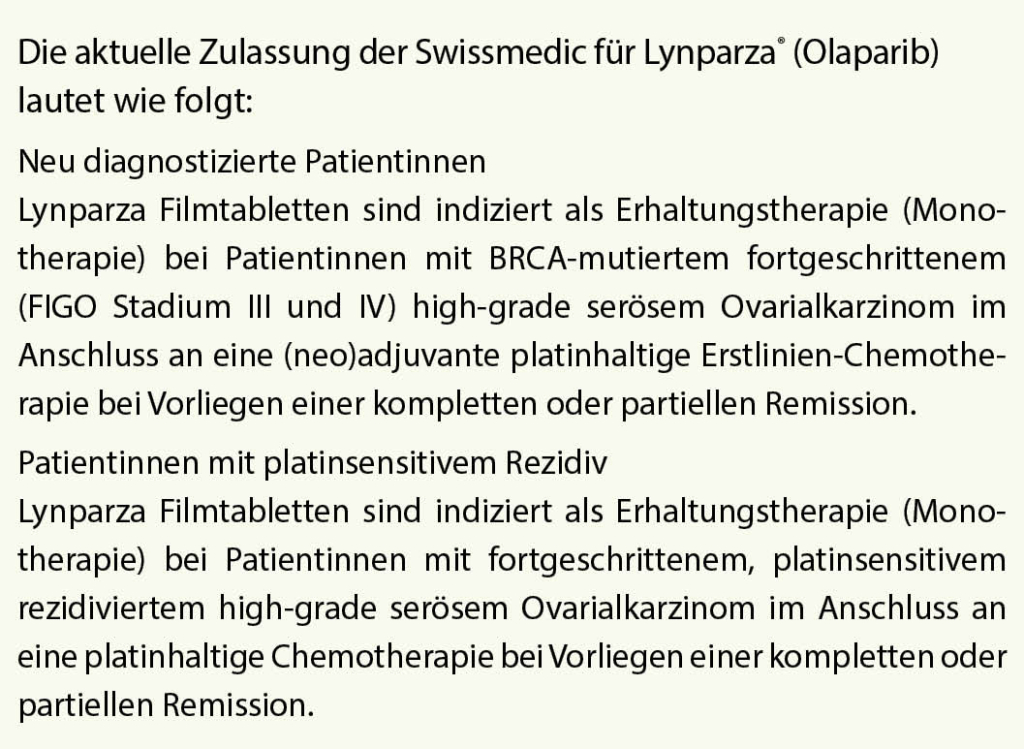 Aufgrund dieses markanten Überlebensvorteils wird Olaparib die Standard-Erhaltungstherapie bei Patientinnen mit einem BRCA-bedingten rezidivierten Ovarialkarzinom, das auf platinbasierte Chemotherapie anspricht.
