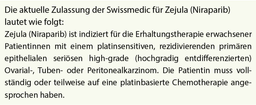 In der Zwischenzeit wissen wir aber, dass auch Patientinnen ohne BRCA-Mutation von den PARP-Inhibitoren signifikant profitieren können. Für Zejula (Niraparib) in der Dosis von zwei Kapseln zu 100 mg einmal täglich, entsprechend einer täglichen Gesamtdosis von 200 mg, wurde in einer grossen Placebo-kontrollierten Phase 3 Studie mit 553 Patientinnen (davon 203 gBRCA mutiert) gezeigt, dass auch Patientinnen ohne BRCA-Mutation bei platin-sensitivem Rezidiv signifikant profitieren. So verlängerte die Erhaltungstherapie mit Niraparib das mediane PFS bei den Patientinnen mit BRCA-Keimbahnmutation um 15,5 Monate – von 5,5 Monaten unter Placebo auf 21,0 Monate unter Niraparib (HR = 0,27; p < 0,001). Aber auch bei den Patientinnen ohne BRCA-Keimbahnmutation betrug der Unterschied noch +5,4 Monate. Im Niraparib-Arm lebten die Frauen im Median 9,3 Monate progressionsfrei gegenüber 3,9 Monate unter Placebo (HR = 0,45; p<0,001).