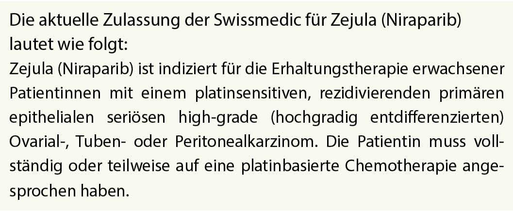 Die oralen PARP-Inhibitoren setzen neue Standards für Malignome, bei denen die DNA-Reparatur genetisch gestört ist, wie zum Beispiel bei allen BRCA-mutierten Entitäten. Das wenig differenzierte seröse Ovarialkarzinom erfüllt bei den BRCA-mutierten Patientinnen genau diese Bedingung. Die Erhaltungstherapie nach einer erfolgreichen platinhaltigen Ersttherapie (SOLO1-Studie) ist nun für Lynparza® (Olaparib), einer oralen Therapie, mit einer sehr eindrücklichen Reduktion des Rezidivrisikos von 70% nach 41 Monaten Follow-up dokumentiert. Ganz aktuelle Daten der SOLO2-Studie (mindestens 2-fach vorbehandelte platinsensitive Patientinnen) zeigen nun erstmals einen eindrücklichen Überlebensvorteil von + 12.9 Monaten. Auch Niraparib (Zejula) ist bei platinsensitivem Rezidiv zugelassen, ohne die Einschränkung des BRCA-Mutationsnachweises.
