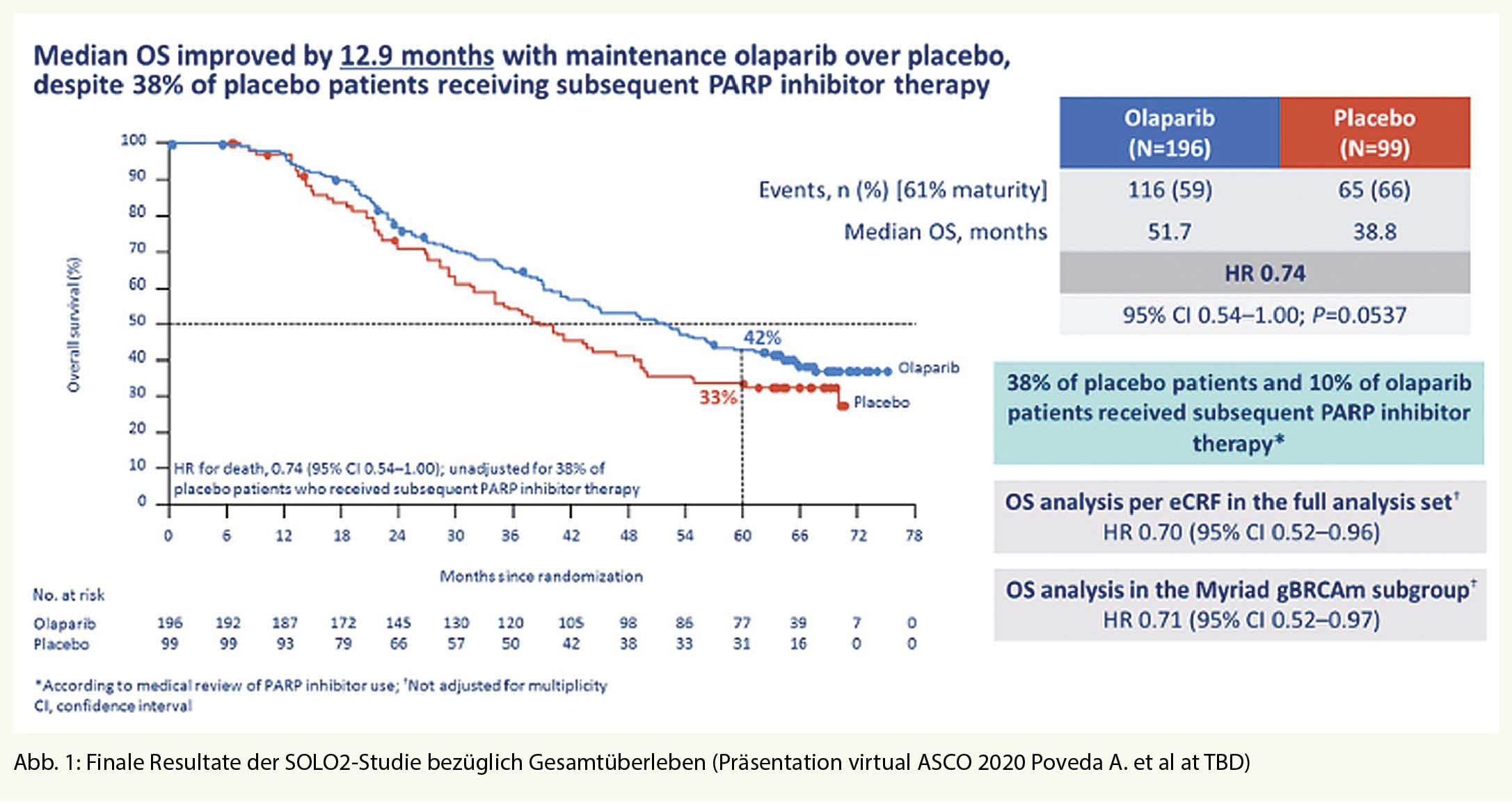 Der primäre Endpunkt war das vom Untersucher dokumentierte Progressionsfreie Überleben (PFS) gemessen ab Randomisierung. Die sekundären Endpunkte umfassten das PFS2 (Zeit ab Randomisierung bis zur 2. Progression), die Lebensqualität und das Gesamtüberleben. In SOLO1 zeigte sich für Olaparib mit einer Hazard Ratio (HR) von 0,30 eine klinisch relevante und statistisch signifikante Verbesserung des vom Investigator beurteilten PFS gegenüber Placebo (95%-KI 0,23 – 0,41; p < 0,0001; median nicht erreicht für Olaparib versus 13,8 Monate für Placebo). Basierend auf Kaplan-Meier-Berechnung betrug der Anteil der Patientinnen, die nach 12, 24 und 36 Monaten progressionsfrei waren, 88%, 74% bzw. 60% für Olaparib versus 51%, 35% bzw. 27% für Placebo. Die finalen Überlebensdaten der SOLO1 Studie werden noch etwas auf sich warten lassen, was nach einer erfolgreichen Erstlinientherapie letztlich ein hoffnungsvolles Zeichen ist.